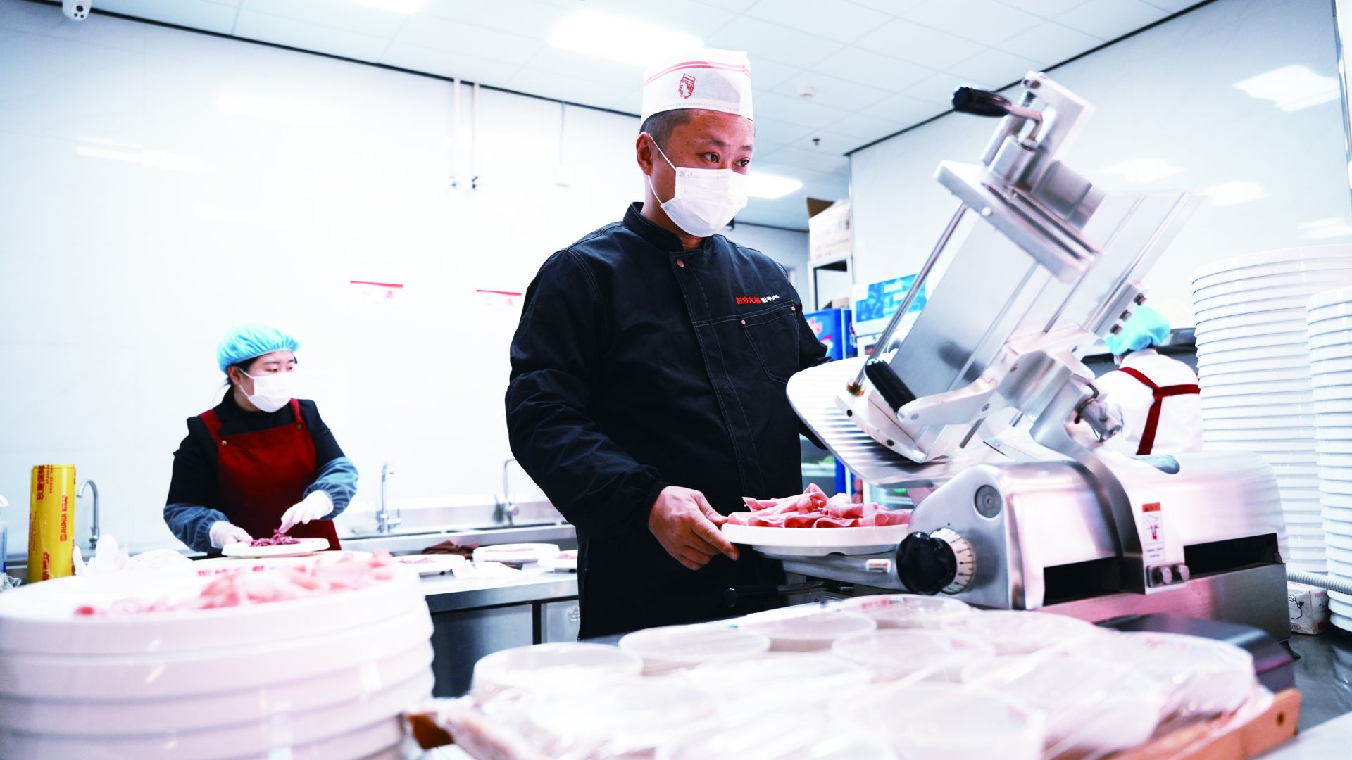 2月5日,农历腊月十八,年味儿渐浓。上午10点半,位于乐陵澳林时代天街的北京阳坊大都涮羊肉店内后厨,已经忙碌起来。店主方鹏博刚挂完一通订餐电话,手机铃声又接着响起。“您好,单间还剩两个,您几位?给您预留!”他接起电话,语气爽朗又利落。此时,店里6个单间已订出4个,后厨的师傅们正有序忙碌着,择菜、洗菜、切菜、码盘、调料、炸辣椒油,明厨亮灶的备菜区,透着浓浓的烟火气。