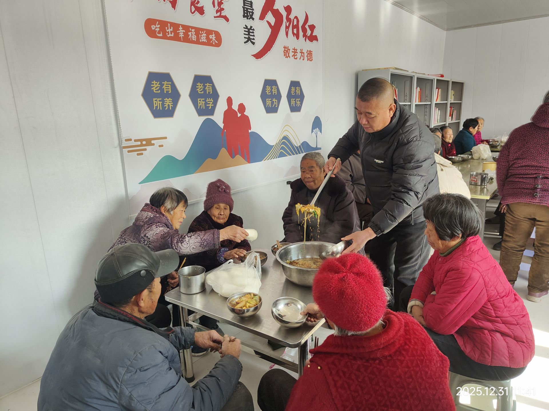 这时,幸福食堂里早已热闹开了。老人们围坐在一起,边吃边唠。“今天的土豆炖肉香不香?”有人高声问。“那还用说!”爱说笑的付红明嗓门亮,“一周5天换着花样来,包子、肉卷、炖肉、鸡蛋汤……吃得饱,还热闹!”旁边86岁的王化仪赶忙接话:“你们是没赶上,上月还有投乒乓球比赛,还能领奖品,中午一块吃大锅菜,美得很!”“腊八那天,老付还给大家唱了段戏!”你一言我一语,屋里笑声不断。