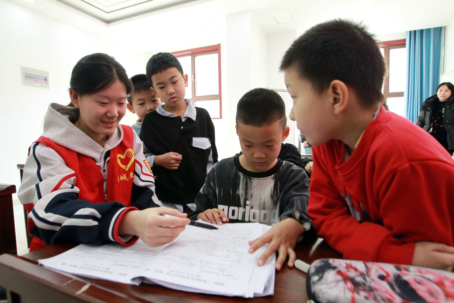 作业辅导环节,志愿者一对一辅导小学生攻克寒假作业难题。从数学应用题逻辑拆解到作文技巧点拨,从书写规范纠正到学习习惯养成,他们带着孩子们认真学习。