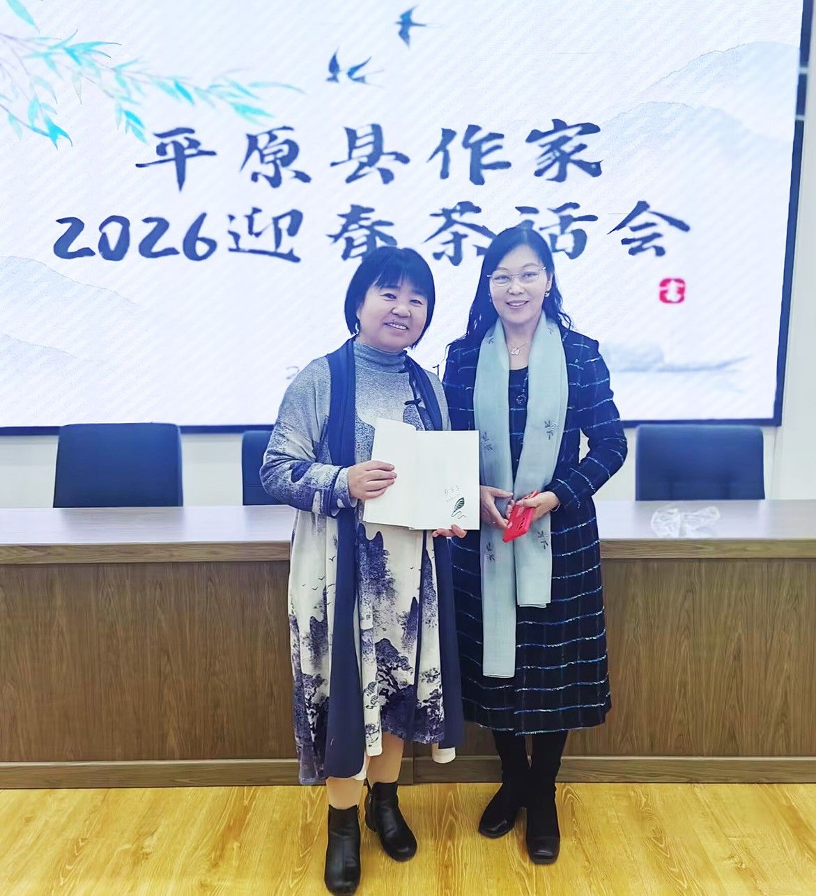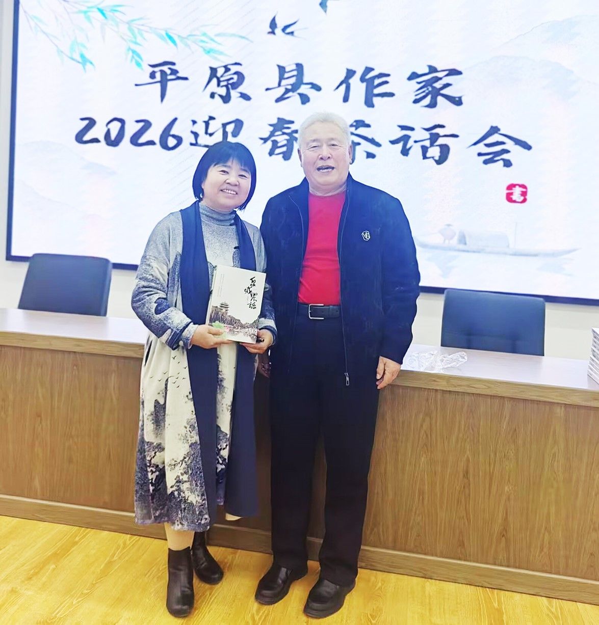 在平原县作家2026迎春茶话会的大屏前,当我把“文以载道,笔耕不辍”与“墨香润心,文采飞扬”两幅书法作品在现场展开,墨香便与茶香在会议室里交融。这不仅是一份赠予,更是我作为平原县一员,对这片乡土最赤诚的致敬。