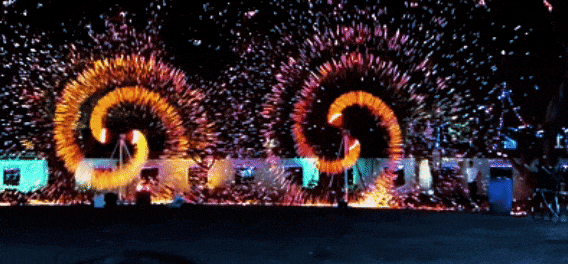 风火轮、火壶、烟花瀑布点亮夜空