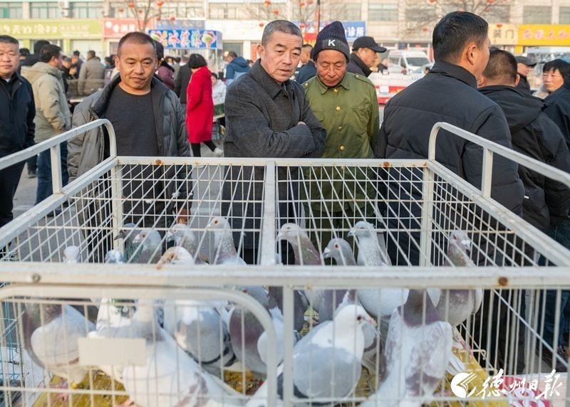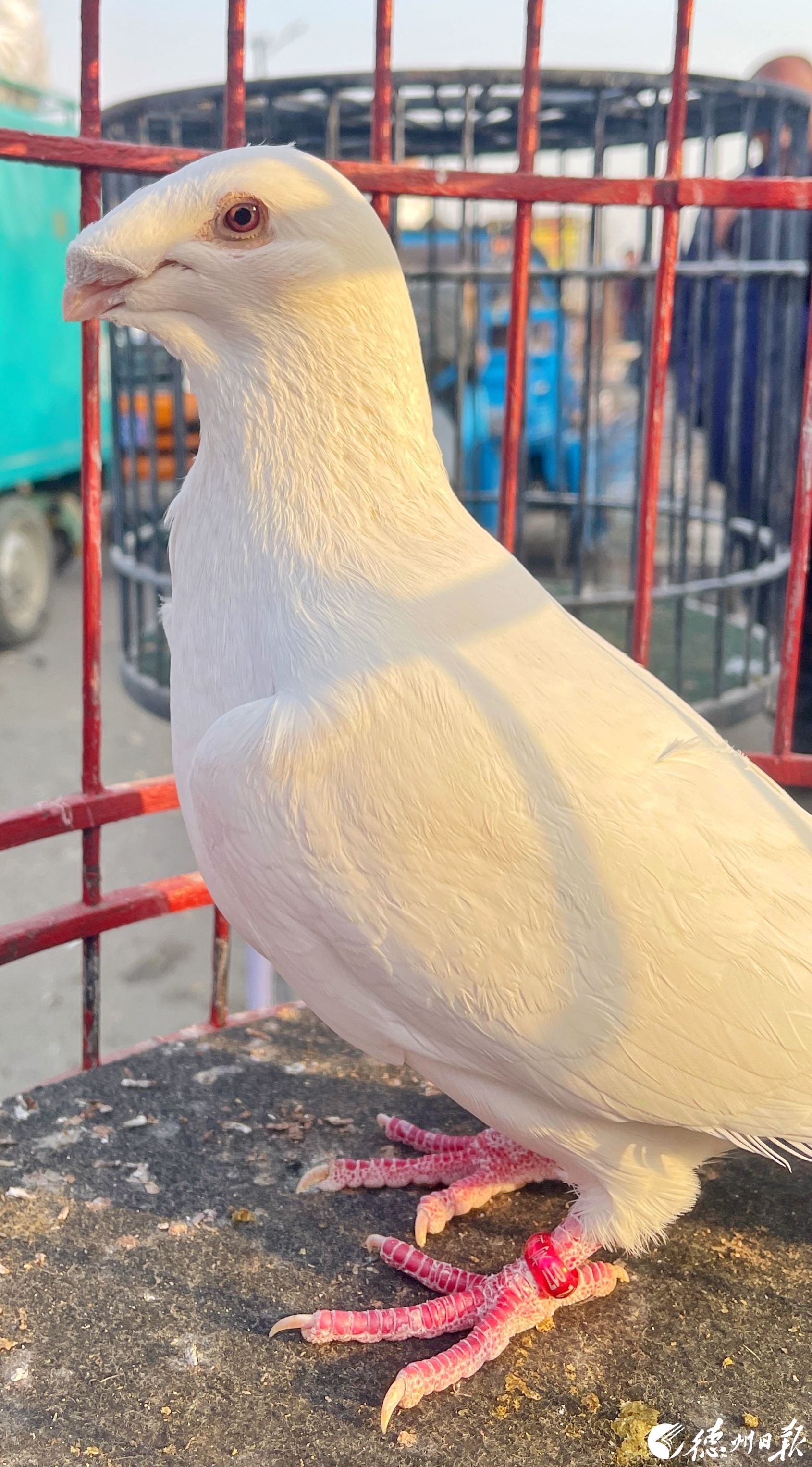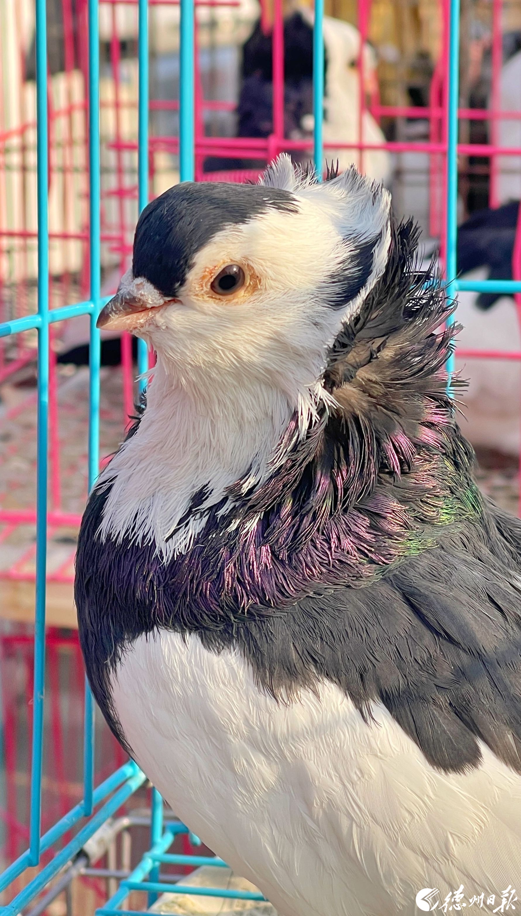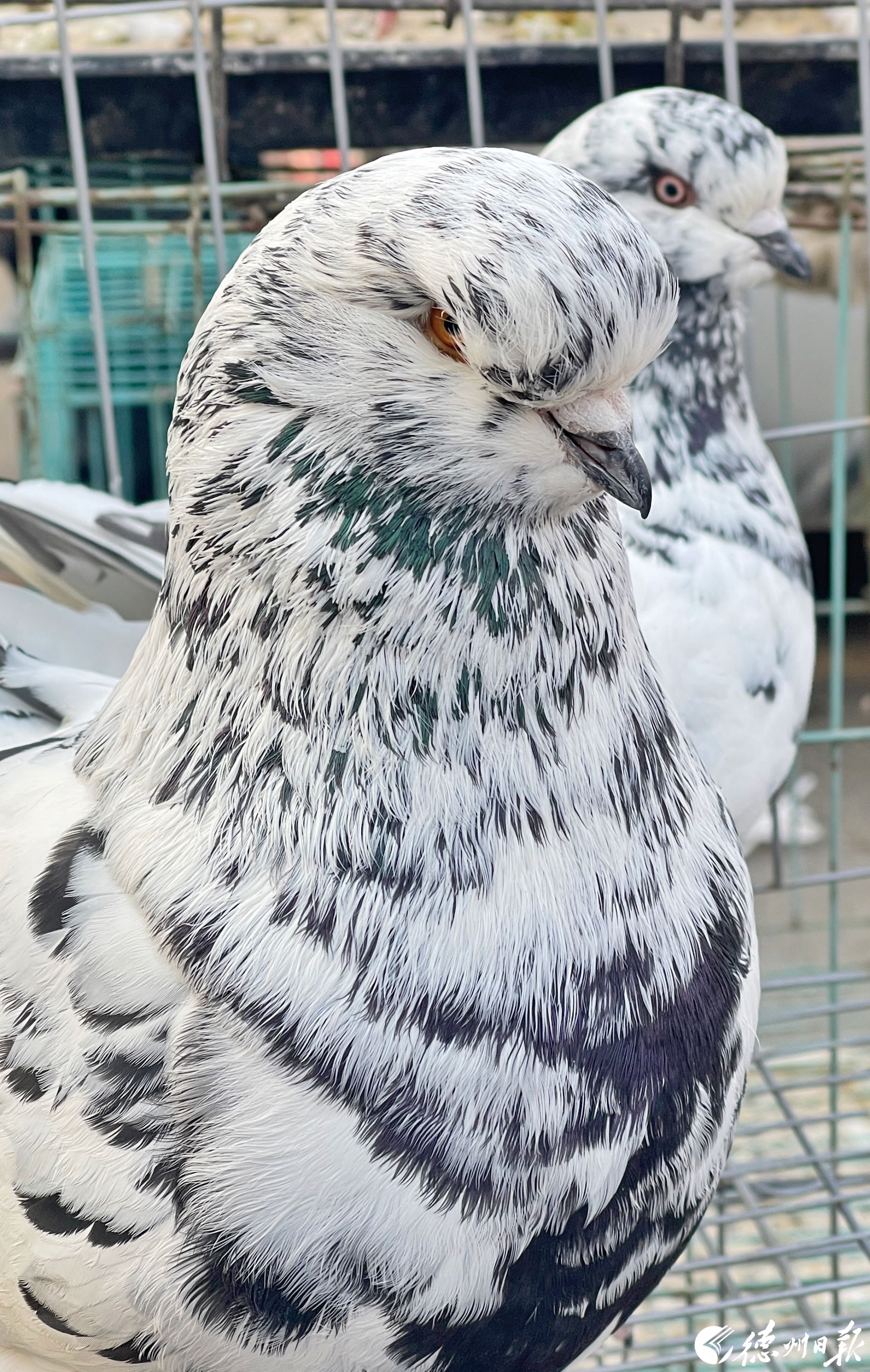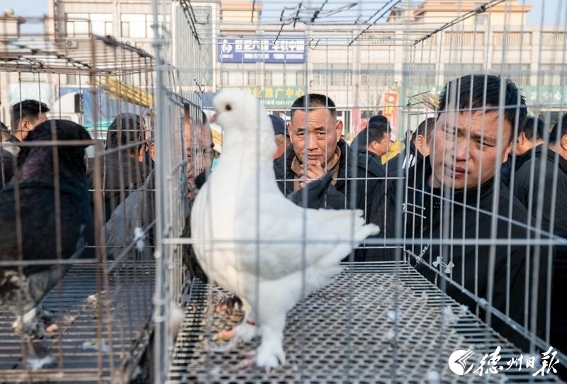 鸽子展销区是盛会的核心地带,也是鸽友们的“主战场”。一排排鸽笼整齐摆放,瓦灰、雨点、白羽等各色鸽子或昂首踱步,或振翅欲飞,圆溜溜的眼睛里透着灵气。“今年多带了几个品种的鸽子,国内的、国外的都有,希望借助这个平台和大家多多交流。”来自北京的客商魏一伟正与一位河北鸽友攀谈,他的摊位前围满了询价的顾客。“我赶恩城鸽子会快连续10年了,这里交通便利,市场规范,鸽友们都很实在。”魏一伟笑着说。