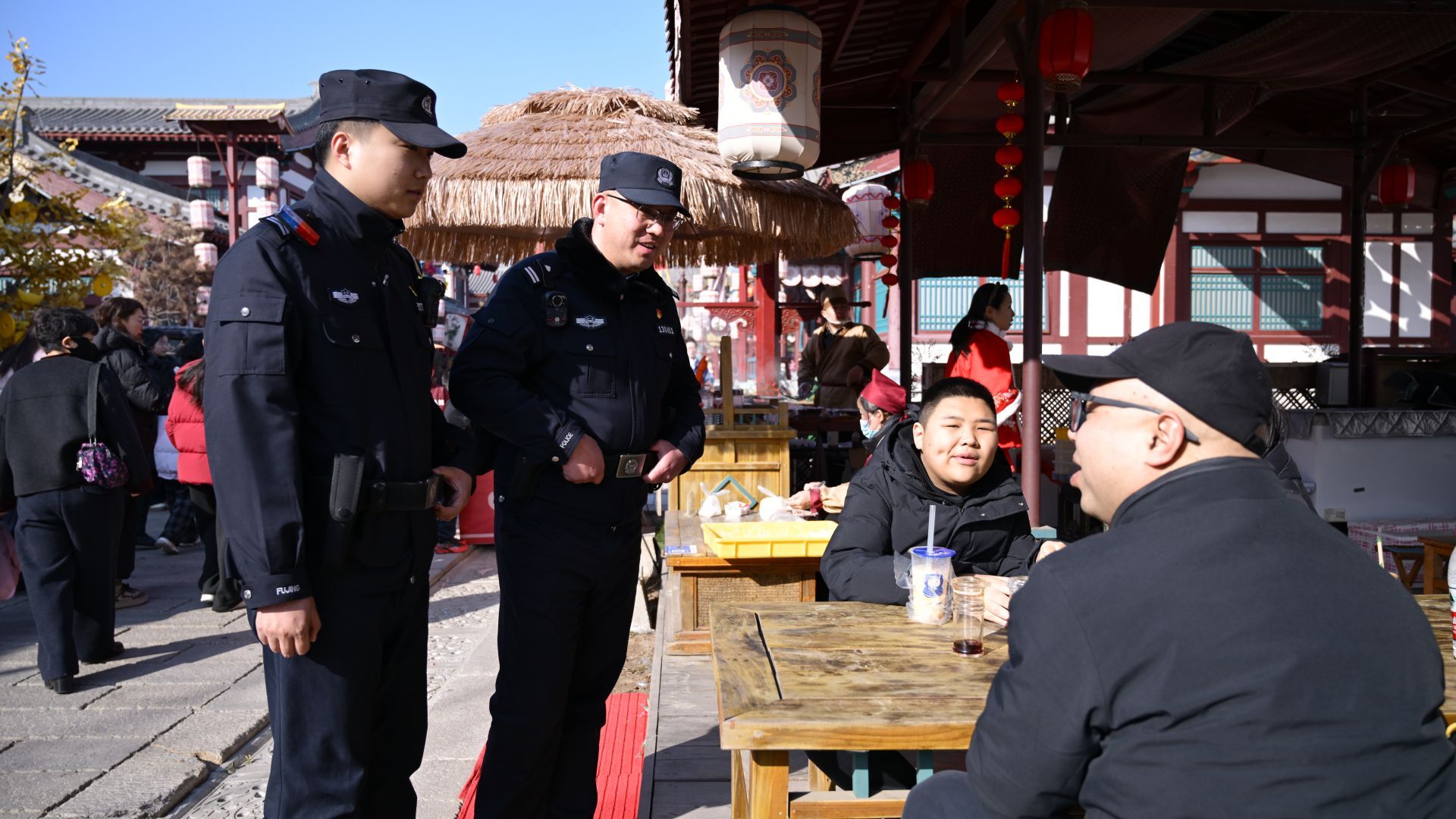 “第一次带孩子来体验唐风年俗,人虽然多,但秩序特别好,民警同志还主动给我们推荐游玩路线,太贴心了!”来自河南的游客张女士抱着孩子,对身边执勤的民警连连点赞。园区内,身着古装的游客与巡逻民警相映成趣,民辅警们穿梭在唐装人流中,既当秩序守护者,又做游览指引员,遇到游客咨询NPC互动点位、节目演出时间,都逐一细致解答,让游客在沉浸式体验中倍感安心。