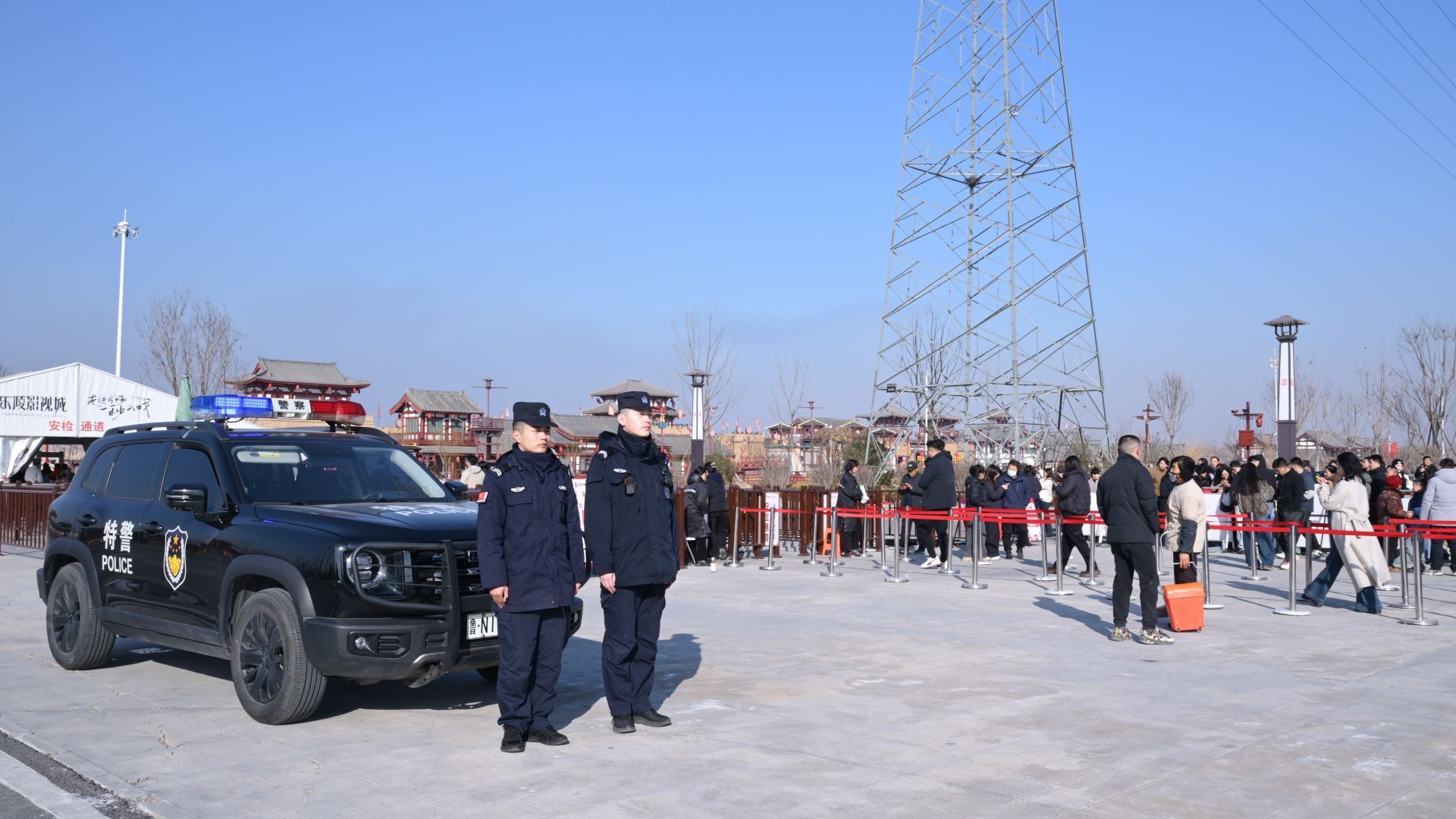 早在春节前一周,乐陵公安便已启动景区安保筹备工作,针对乐陵影视城“国风好戏”活动的沉浸式体验、多区域联动、大客流聚集等特点,组建专项安保小组,多次实地踏勘园区地形。从锦绣唐园的亭台楼阁到唐人街1900的异域街区,从无人机烟花秀的燃放点到非遗市集的人流密集区,民辅警们逐一排查安全隐患,标记重点守护点位,精准测算客流承载量。