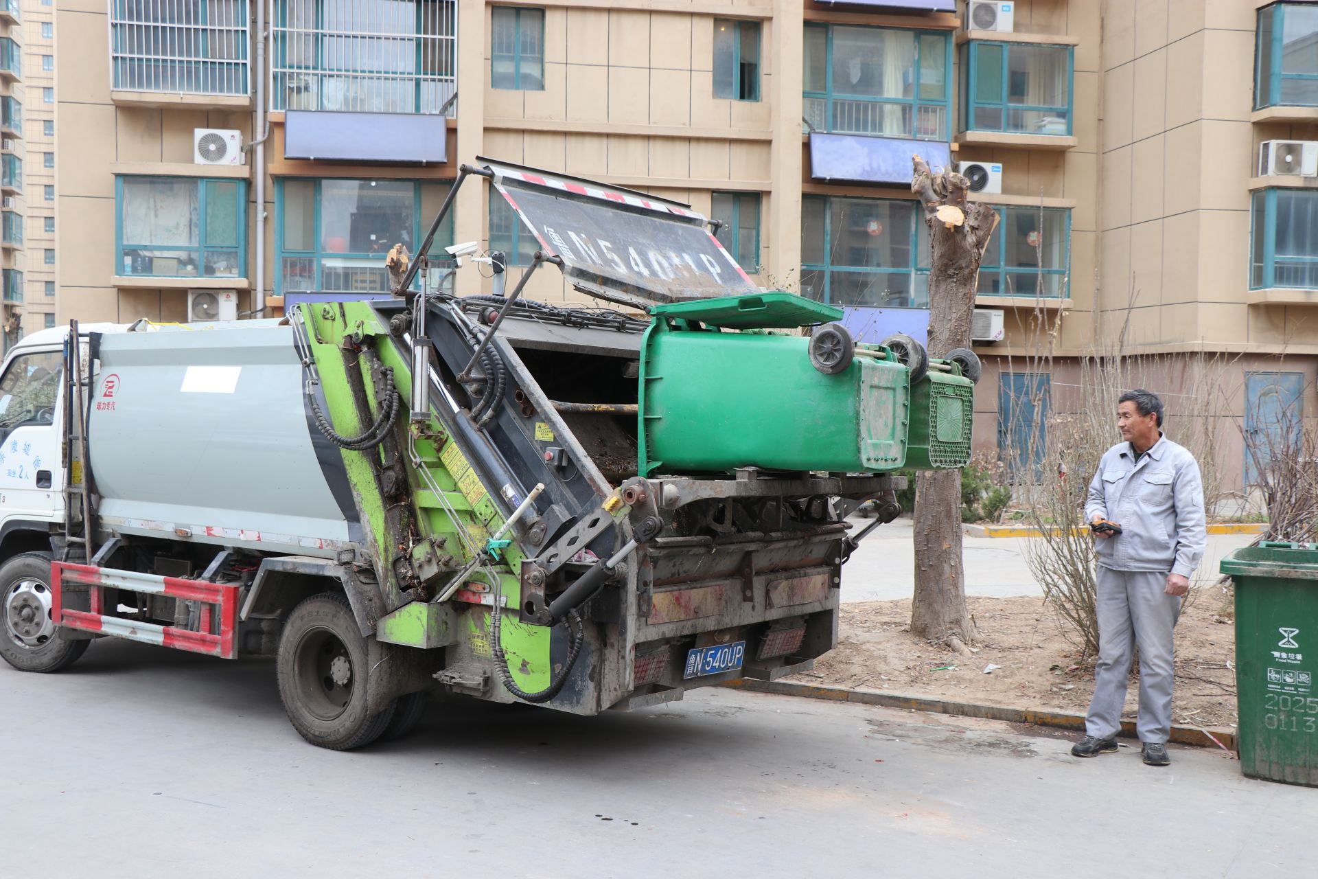 杨艳贵负责城区近20个小区的收运,他的工作有着精确到分钟的节奏:五点开始,先收天泰城、湖畔花园等几个大型住宅区,装满一车便直接运往15公里外的光大环保能源有限公司进行处理;返回后紧接着收运香邑水岸、皇冠花园等小区;第三车则是龙啸渤海城、花庭美墅等区域。每个点位他都烂熟于心,与搭档的配合也早已默契无间。到达点位,两人一同下车,韩本香挂好桶架,杨艳贵就在一旁操作升降装置,看着满载的垃圾桶被稳稳提起、倾倒、复位,整个过程干脆利落。