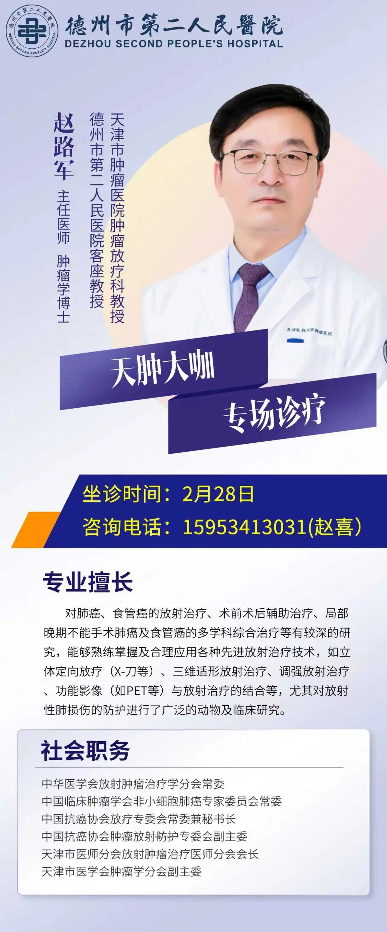 专家有约 | 2月28日,天津市肿瘤医院放射治疗专家赵路军教授来德州市第二人民医院开展疑难病例会诊 2026-02-27 15:05 德州日报 0 2月28日,天津市肿瘤医院肿瘤放射治疗科赵路军教授到德州市第二人民医院带教查房,并开展疑难病例会诊等诊疗活动,患者可提前预约咨询。 预约咨询电话 赵喜:15953413031 德州日报新媒体出品通讯员|王晓军 编辑|张洁审核|滕璐 终审|李玉梅