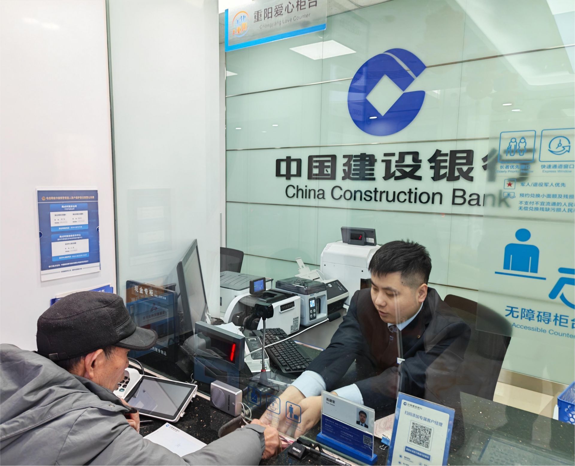 得知老人需支取3万元现金后,崔晓丽一边熟练地协助老人刷证取号,一边递上一个操作简易的老年专用叫号器:“大爷您先在爱心专座歇会儿,到号了这机子会大声提醒。”