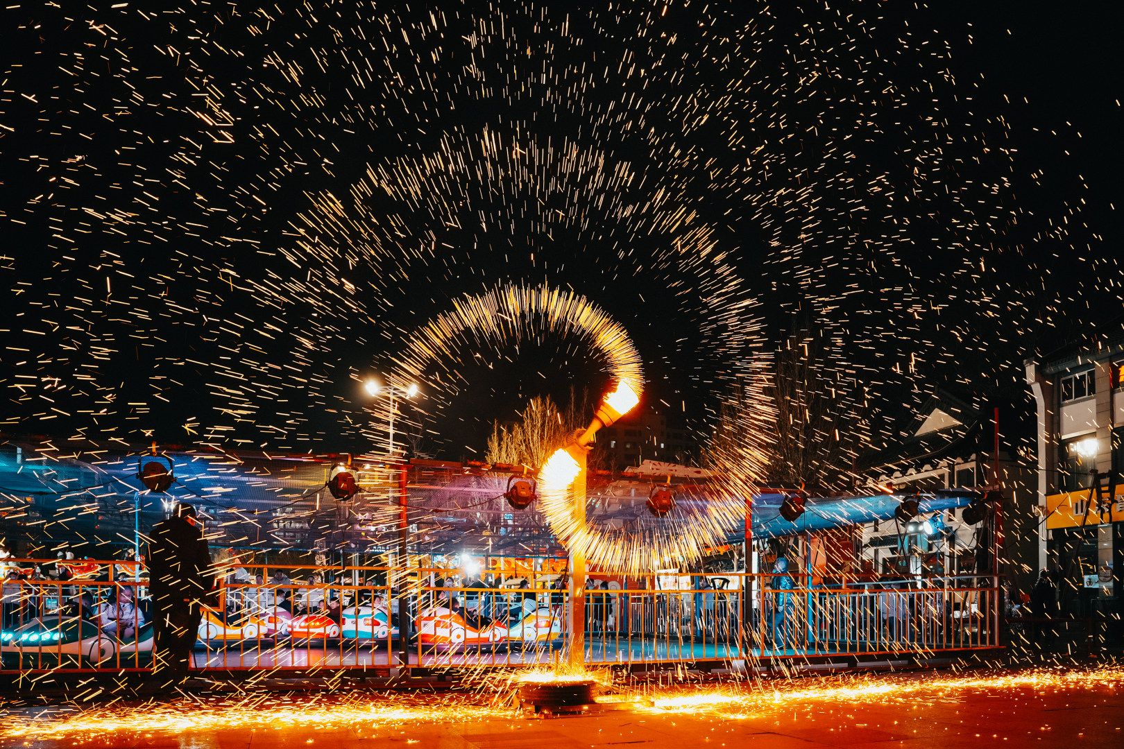 晚上8点30分,“王婆说媒”落幕,火壶演出开始。表演者先以特技喷火点亮夜空,继而挥洒火壶,漫天火星如雨绽放,游客纷纷举起手机,定格这一震撼瞬间。压轴时刻,璀璨烟花瀑布倾泻而下,点亮整个街区,为这场热闹的庙会写下完美句号。