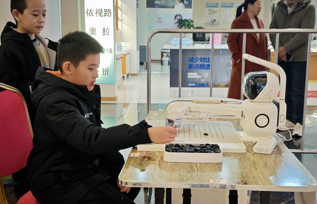 比赛设高段组(3段及以上)和低段组(1、2段),全天共进行5轮较量。赛场上,棋手们凝神静坐、落子从容,在方寸棋盘间展开智慧交锋。赛场外,赛事配套活动同样人气高涨。在“人机对弈”体验区,AI围棋机器人吸引众多小棋手争相挑战,科技感十足的对弈让参与者大呼过瘾。恰逢元宵佳节前夕,现场还设置了民俗体验区,观众可参与猜灯谜、做花灯等互动,并凭参与券抽取银座购物卡、围棋体验课等福利。