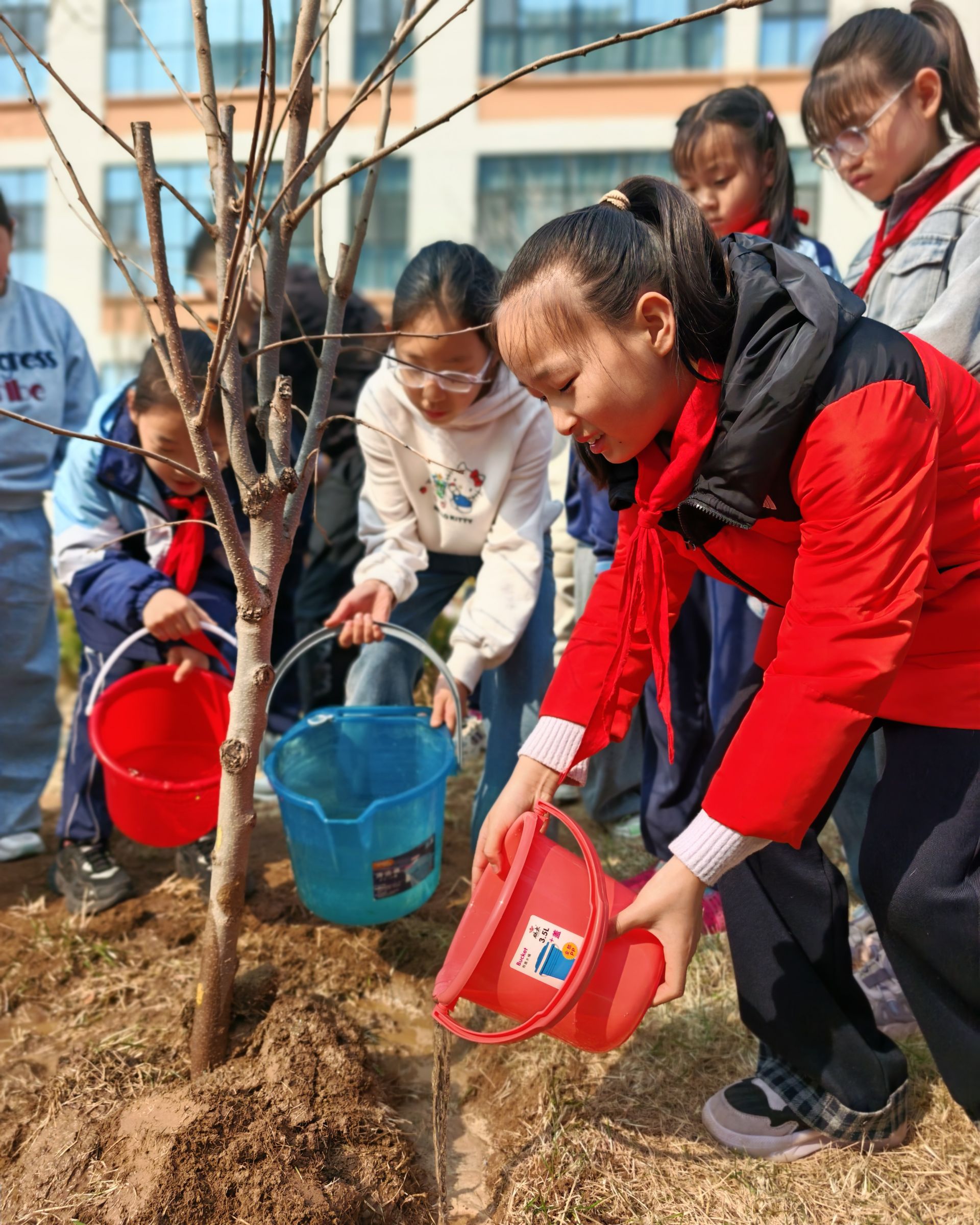 活动现场,师生家长分工协作、默契配合,扶苗、填土、压实、浇水,每一个环节都认真细致。在大家的共同努力下,一棵棵桃、李、杏树苗错落挺立,为校园勾勒出盎然春意。“这是我第一次亲手种树,感觉特别有意义。在植树中,我体验到了劳动的意义,明白了保护环境的重要性。”参与植树的学生翟浩宁兴奋地说。