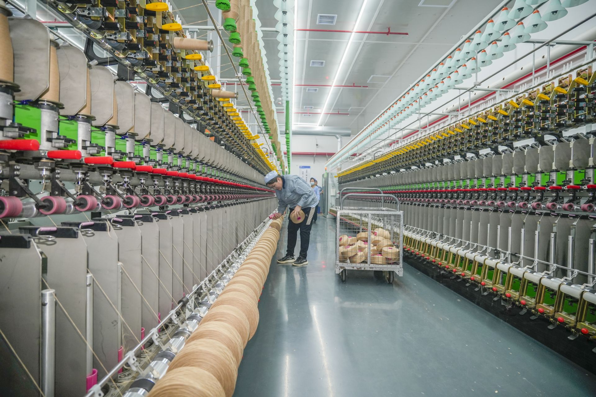 山东德信羊绒科技股份有限公司生产车间内,工人及时更换纱线筒