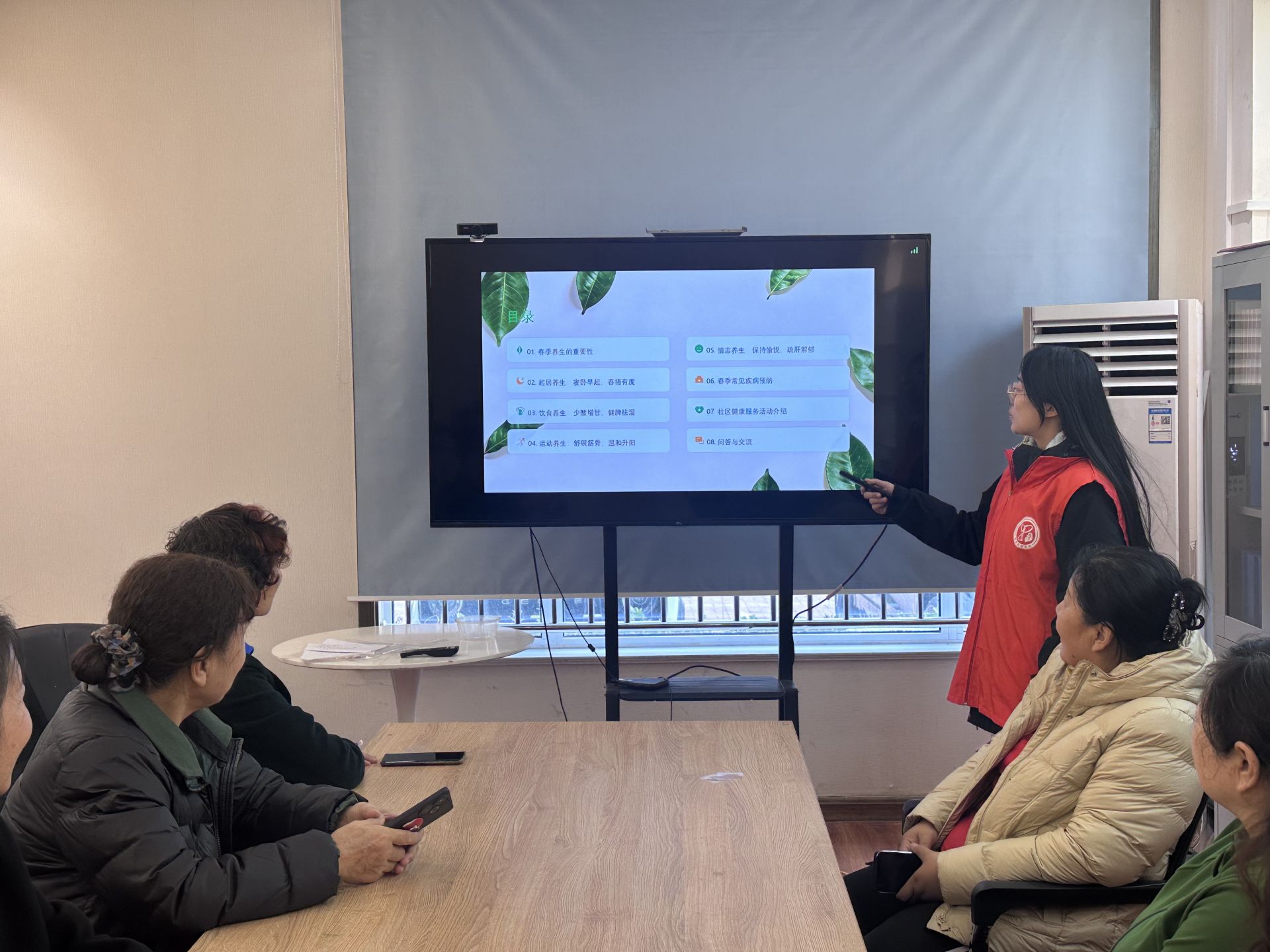 活动中,宣讲员用通俗易懂的语言,结合春季时令特点,为居民带来了一场干货满满的养生课。从“春季养生的重要性”切入,宣讲员强调春季是阳气生发的关键期,打好健康基础至关重要。在“起居养生”环节,宣讲员提醒大家要“夜卧早起”,顺应自然规律,同时注意“春捂有度”,不要因气温回升而过早脱去厚衣。针对春季肝气旺盛的特点,宣讲员提出“少酸增甘,健脾祛湿”的饮食原则,建议大家多吃山药、红枣等甘味食材,少吃山楂、柠檬等酸味食物。在运动养生方面,鼓励大家“舒展筋骨,温和升阳”,推荐散步、太极拳等温和运动方式,避免剧烈运动耗损阳气。情志养生部分则强调“保持愉悦,疏肝解郁”,建议多听音乐、踏青赏花,保持心情舒畅。针对春季多发的感冒、过敏等问题,宣讲员还科普了常见疾病的预防妙招。最后,社区工作人员介绍了即将开展的健康义诊、上门巡诊等系列服务,并设置了问答交流环节,居民们纷纷举手提问,宣讲员耐心解答,现场笑声不断。