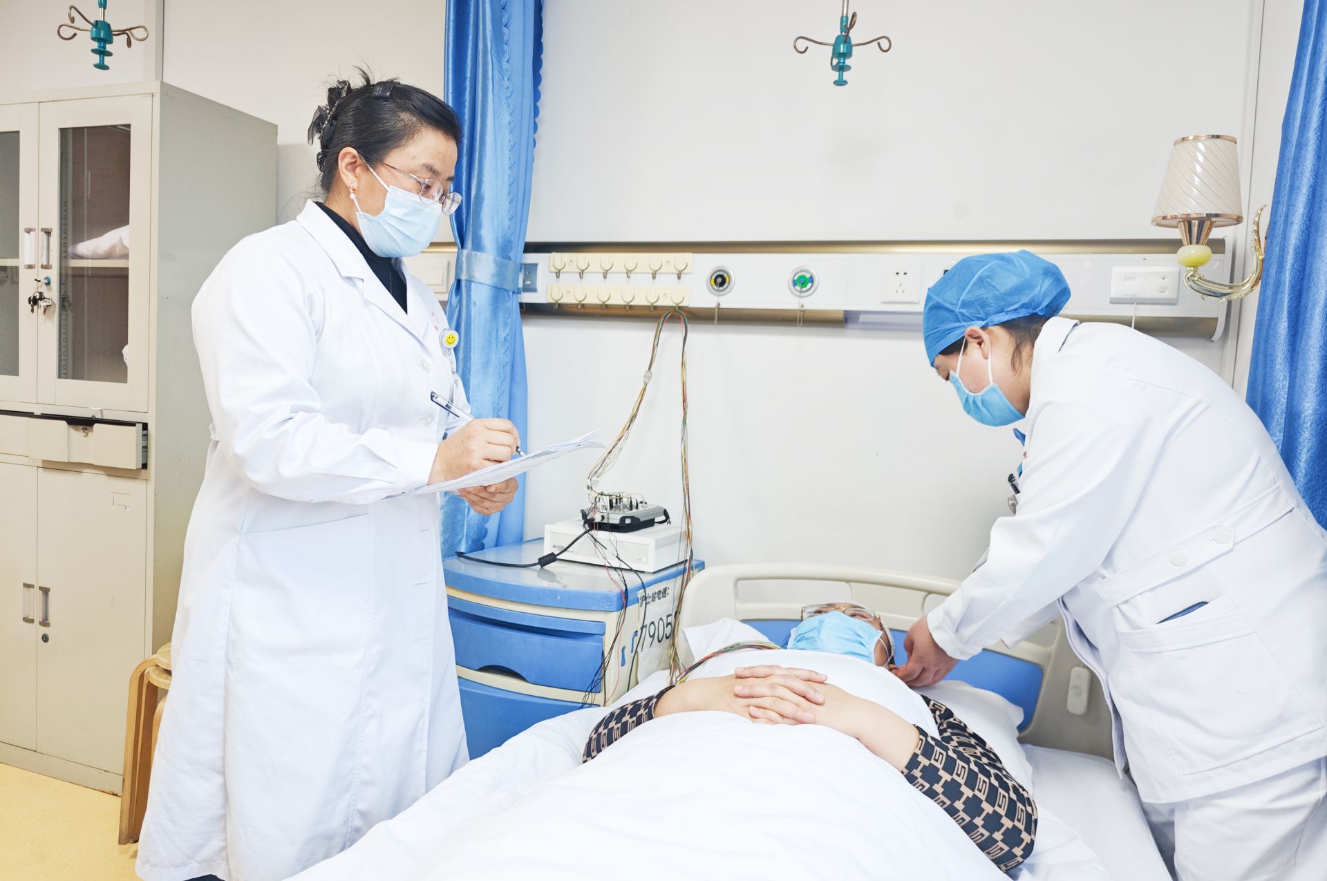 李娜(左)为患者做睡眠监测。记者 唐志梅 摄
