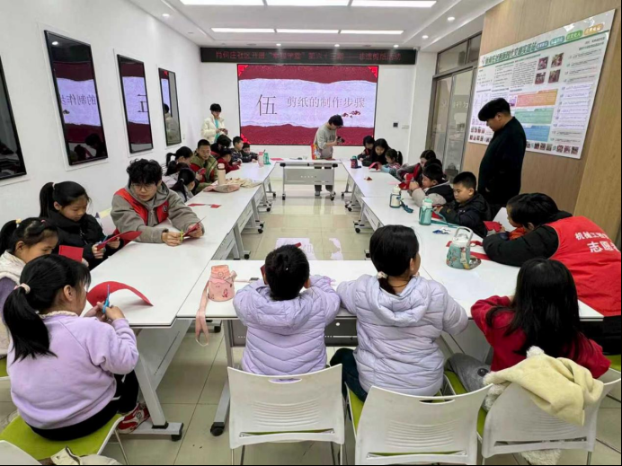 活动中,大学生志愿者结合提前准备的剪纸作品和教学素材,用通俗易懂的语言,向青少年们讲解了剪纸这项非遗的悠久历史。随后,大学生志愿者们化身“非遗导师”,一步步示范折纸、描线、剪刻的全过程,青少年神情专注、兴致高昂,纷纷拿起剪刀和红纸,认真地折叠、勾勒、裁剪,一张张普通的红纸渐渐“活”了起来。