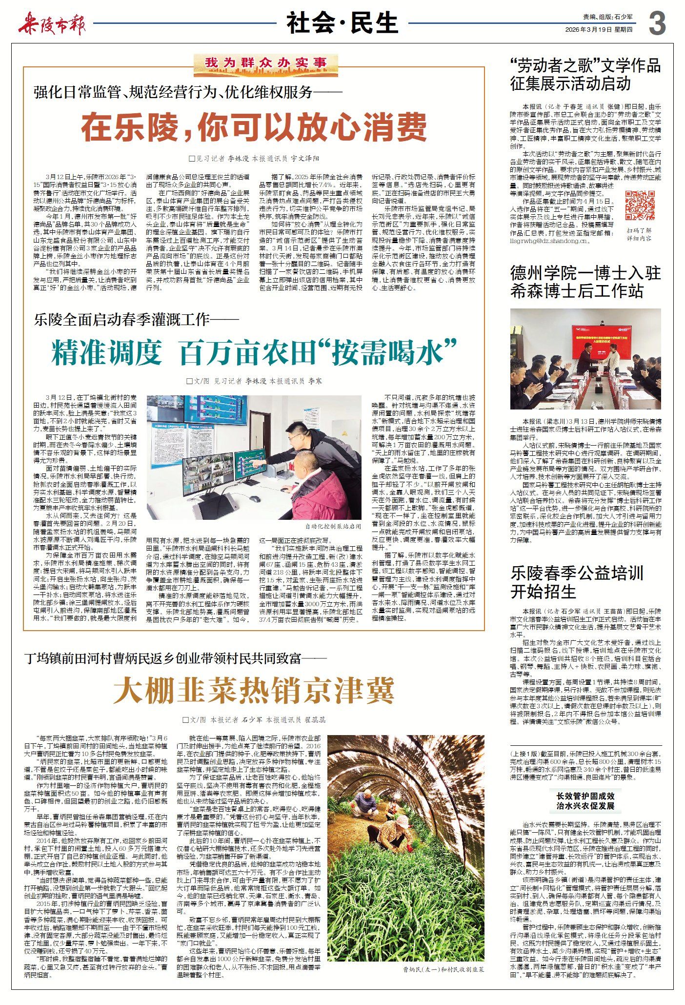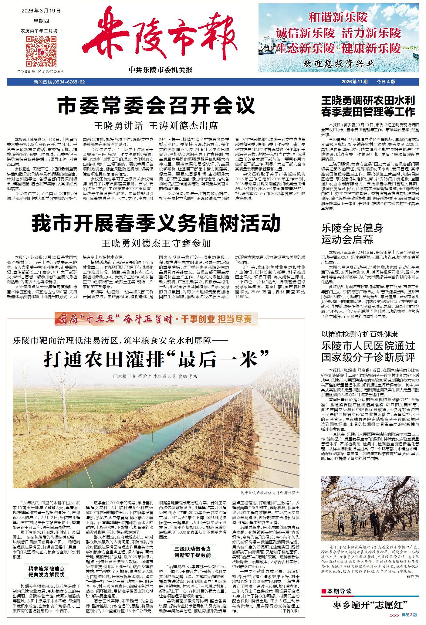 乐陵市新闻周报(3月13日至3月19日) ©原创 2026-03-19 07:39 0 ▶乐陵:打通农田灌排“最后一米”(点击查看详情) ▶乐陵:枣乡遍开“志愿红”(点击查看详情) ▶乐陵:强化日常监管、规范经营行为、优化维权服务保障放心消费(点击查看详情) ▶乐陵全面启动春季灌溉工作—— 把水送到每块急需田地里(点击查看详情) ▶乐陵曹炳民返乡创业,他种的韭菜热销京津冀(点击查看详情) ▶乐陵元素亮相香港国际影视展(点击查看详情) 德州日报新媒体出品编辑|于春芝审核|胥爱珍 终审|冯光华