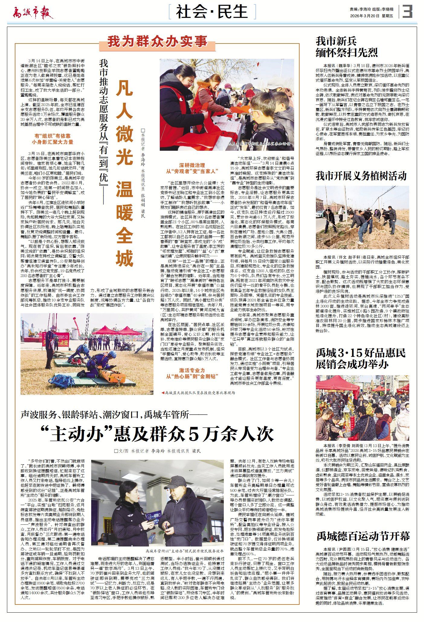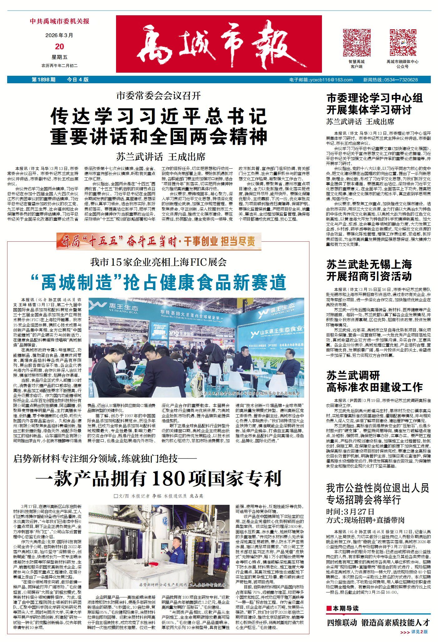 禹城市新闻周报(3月14日至3月20日) ©原创 2026-03-20 14:38 德州日报 0 ▶禹城15家企业亮相上海FIC展会 | “禹城制造”抢占健康食品新赛道。(查看详情) ▶启势新材料专注细分领域,练就独门绝技 | 一款产品拥有180项国家专利。(查看详情) ▶禹城构建技能人才生态体系,重点产业高技能人才占比提升至35% | 四维联动 锻造高素质技能人才。(查看详情) ▶禹城市推动志愿服务从“有”到“优”:凡人微光 温暖全城。(查看详情) ▶德报读图 | 禹城:田畴染新绿 春管正当时(查看详情) 德州日报新媒体出品编辑|李晓楠审核|李榕 终审|尹滨 (作者:德州日报)