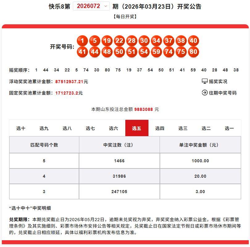 2026年3月23日,快乐8游戏第2026072期开奖,快乐8游戏1000万元促销活动的第一期。
