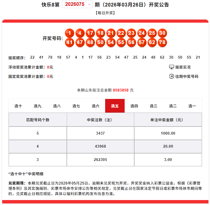 2026年3月26日,快乐8游戏第2026075期开奖,快乐8游戏1000万元促销活动的第四期。