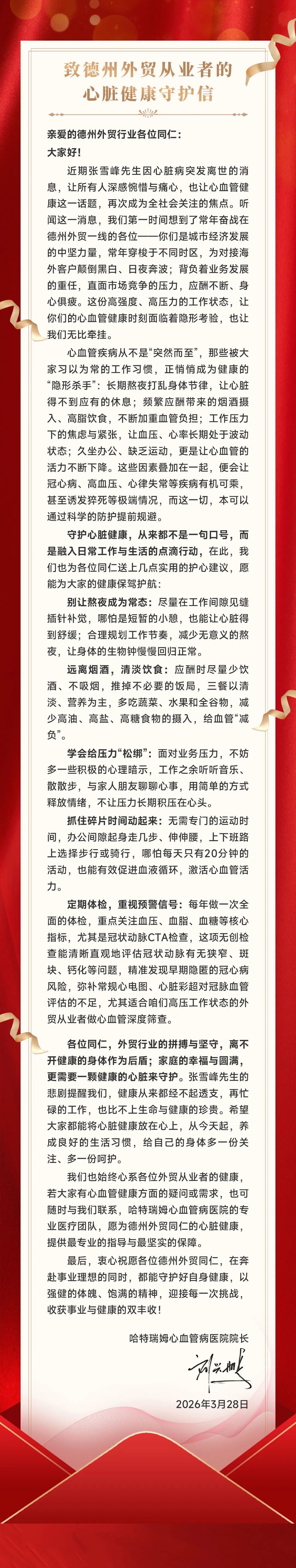 哈特瑞姆心血管病医院院长致信,为全市外贸同仁送上护心提醒,愿大家在奔赴事业的同时,也能守护好自己的心脏健康。