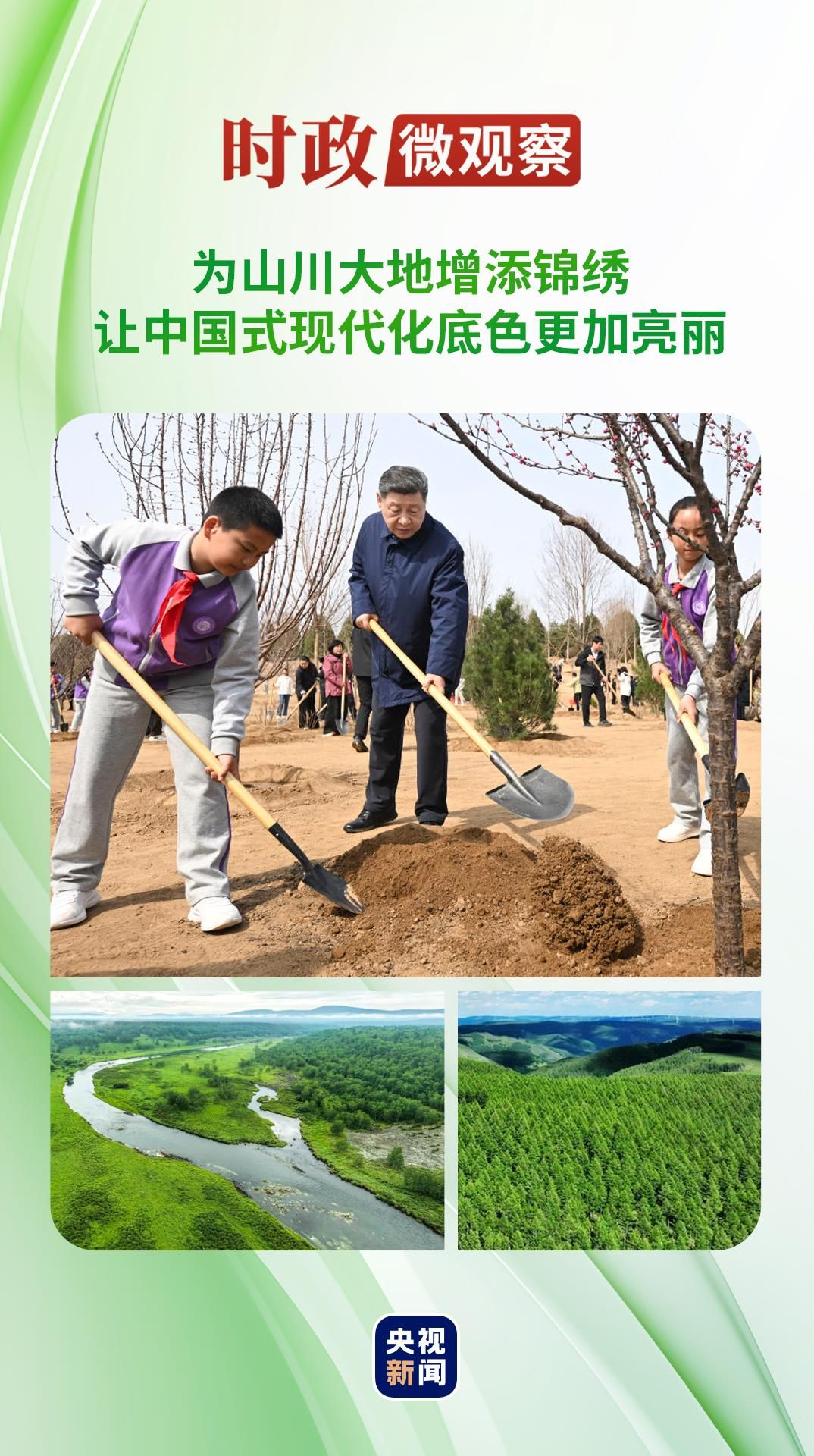 “植树造林是美丽中国建设的一项重要任务,要咬定青山不放松,立足当下、着眼长远、接力奋进,把这件利国利民的大事扎实做好。”习近平总书记的谆谆话语,激励着新时代奋斗者用实际行动描绘人与自然和谐共生的美丽画卷,让中国式现代化的底色更加亮丽。