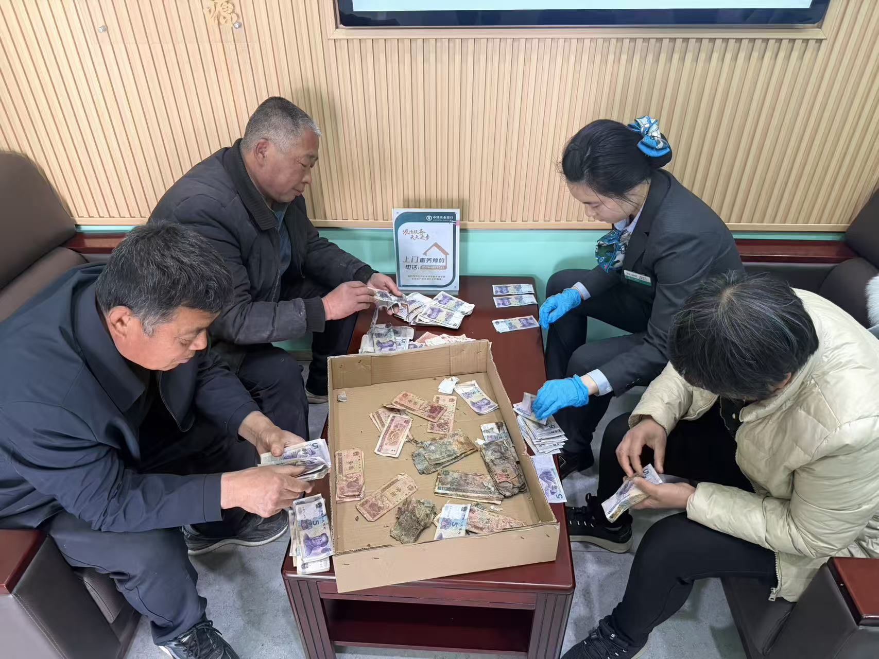 大堂经理见状,立刻迎上前,轻声安抚老人情绪,并联系柜员和内勤行长,启动残损币兑换绿色通道。内勤行长迅速安排柜员为客户整理残破币,工作人员戴上手套,小心翼翼地将每一张纸币展开、抚平,逐张鉴别真伪与可兑换金额。由于纸币破损严重,工作人员便一张张手工清点、拼接,甚至用镊子夹起细小碎片比对。旁边的同事也主动加入进来,有的帮忙整理,有的协助登记。最终,经过3个小时清点核对,为客户兑换了7843元现金。