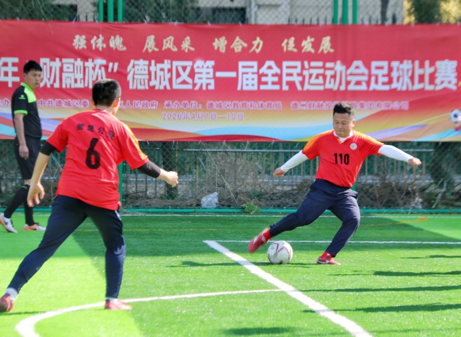 4月7日,2026年“财融杯”德城区第一届全民运动会足球比赛在德城区体育公园开赛。赛事为期4天,9场精彩对决,6支队伍、110余名运动员同台竞技。