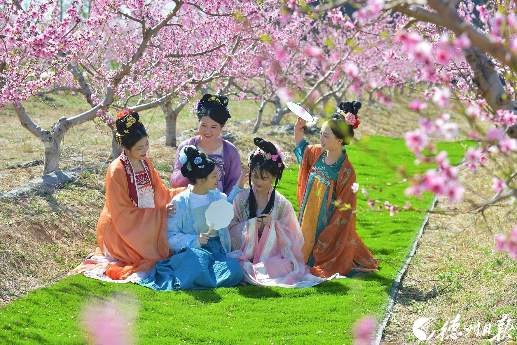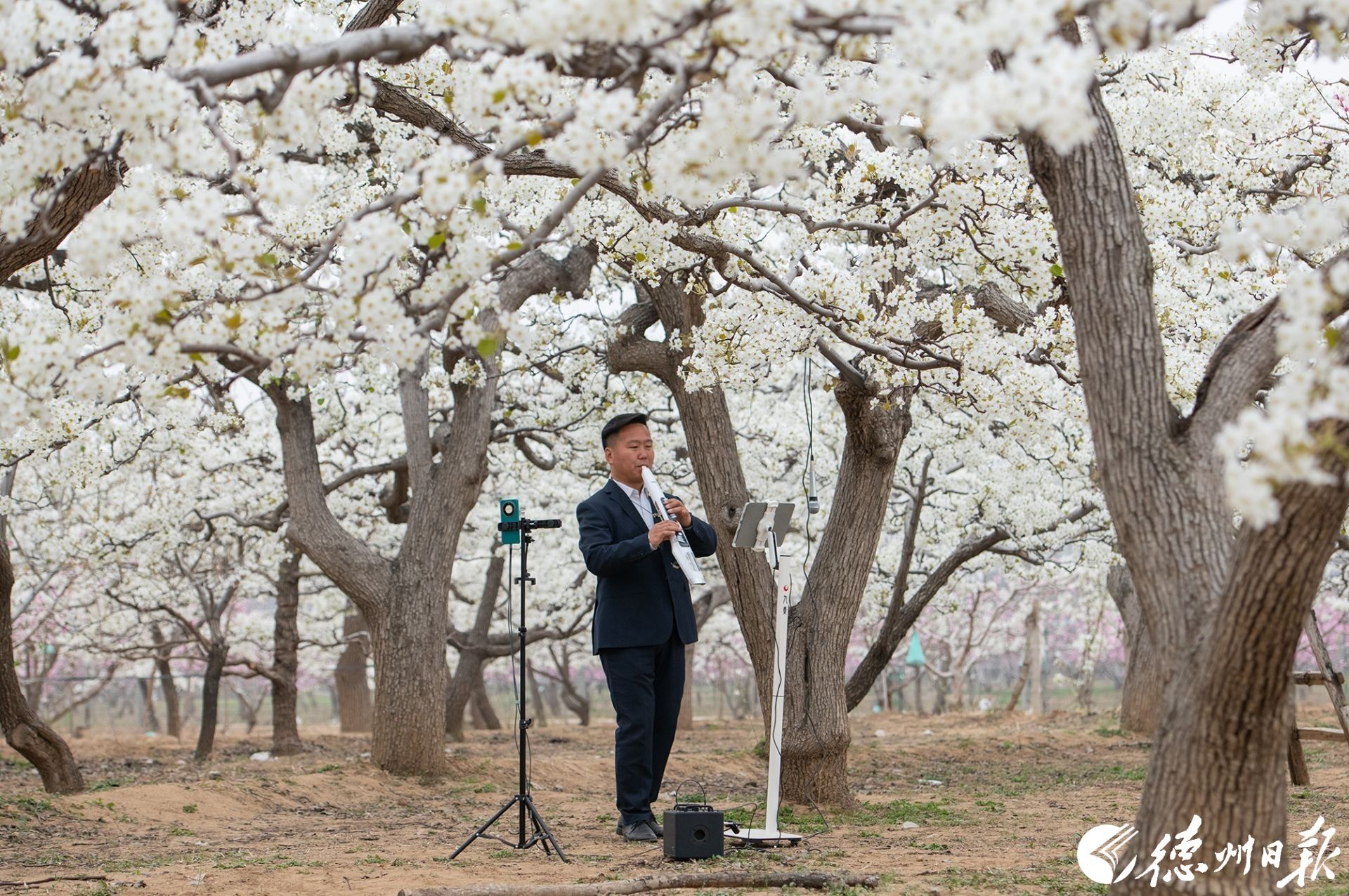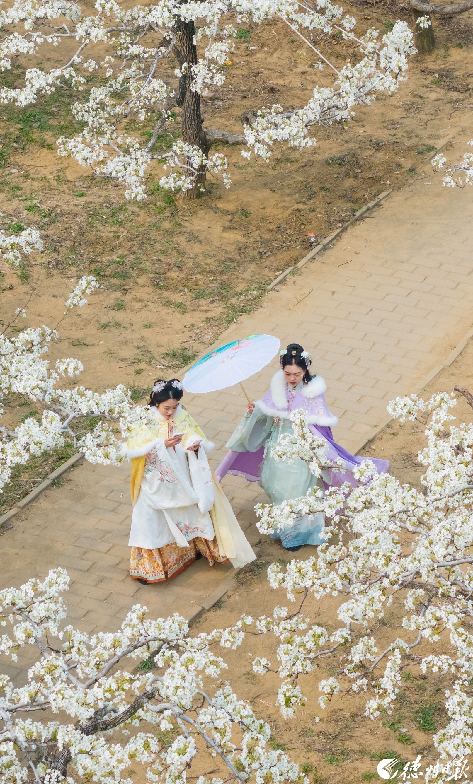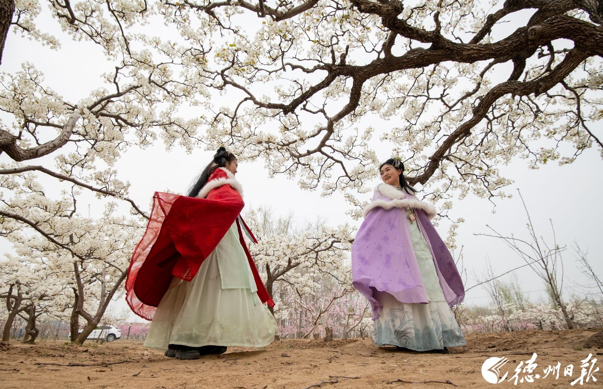 在夏津香雪园,千亩梨花如雪绽放,游客身着古装赏花,从“看景”变为“入景”,解锁春日新景致。