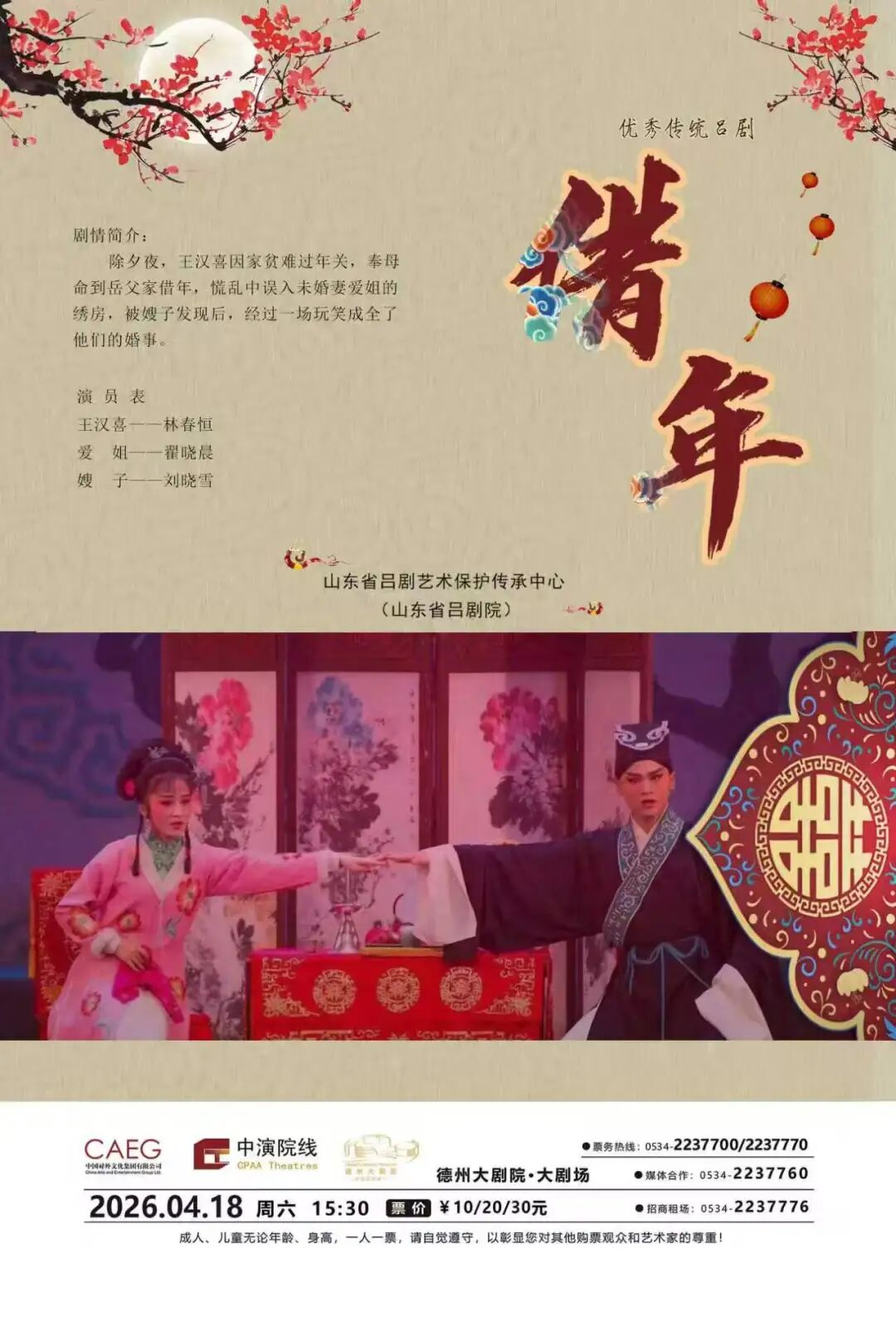 《借年》是吕剧经典传统小戏,讲述除夕之夜,贫寒书生王汉喜因家贫无粮,前往岳父家借年货,与未婚妻爱姐在闺房相会。二人互诉衷肠,爱姐慷慨相助,后被嫂子撞见。嫂子风趣打趣,最终成人之美,促成二人婚事。全剧生活气息浓郁,唱腔质朴流畅,情节生动温馨,是极具代表性的吕剧名作。