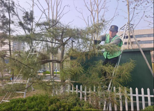 针对大龙柏和黑松的不同生长特性分类施策。大龙柏以疏剪为主,清除过密枝、病虫枝、交叉枝,保留自然挺拔的树形,营造出通透灵动的视觉效果;黑松则通过短截、蟠扎、分层修剪等手法精心塑形,展现苍劲古朴、层次分明的松韵风采。