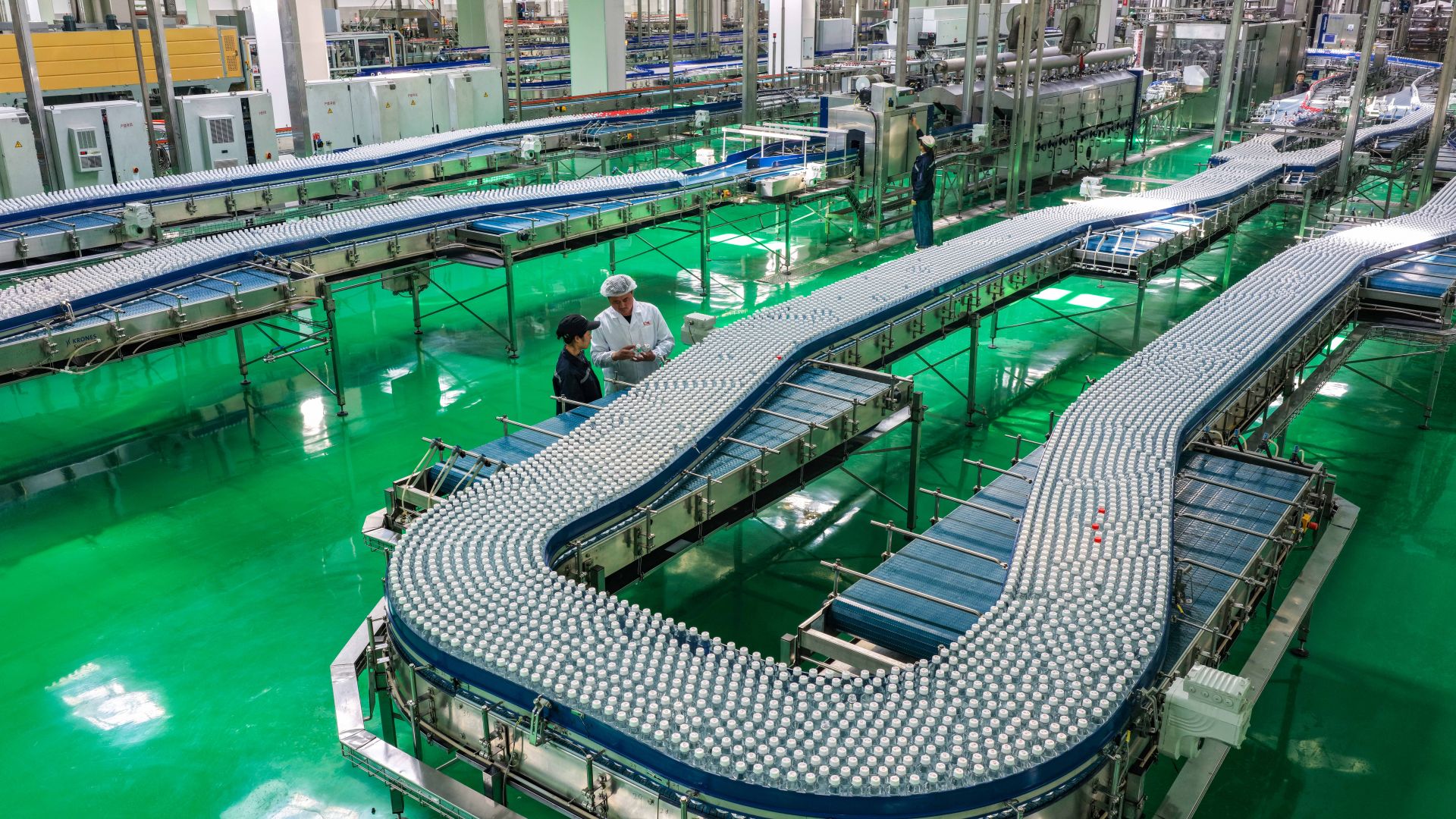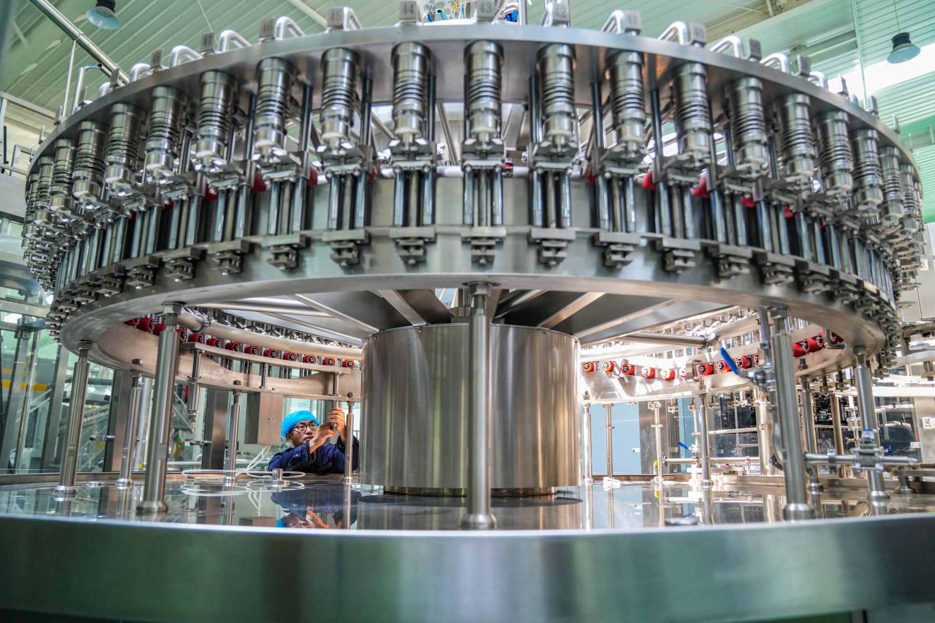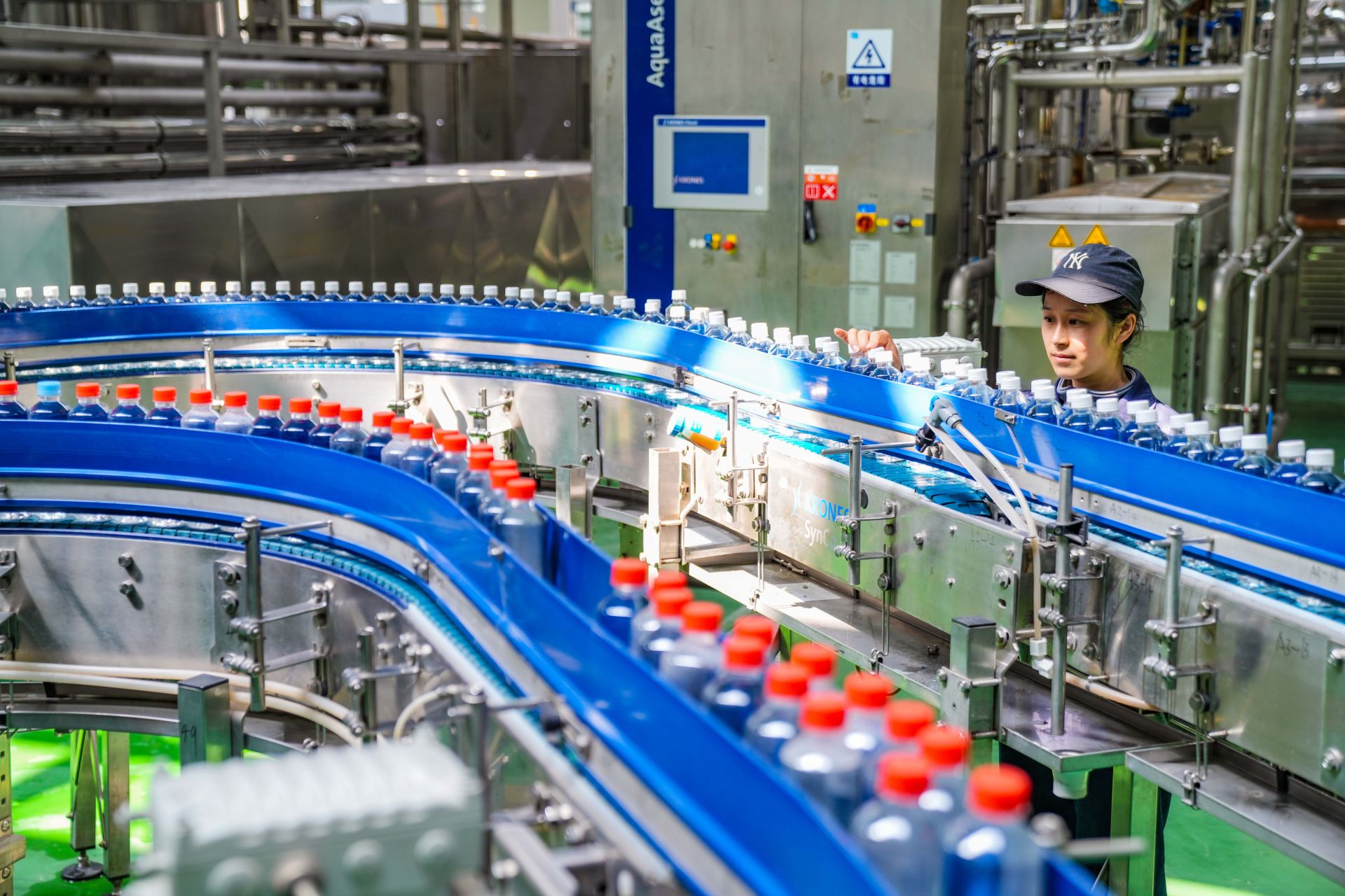 4月10日,在乐陵市经济开发区汇源果汁数字化生产车间,技术工人在生产线巡检、把控产品质量、确保生产线稳定运行。