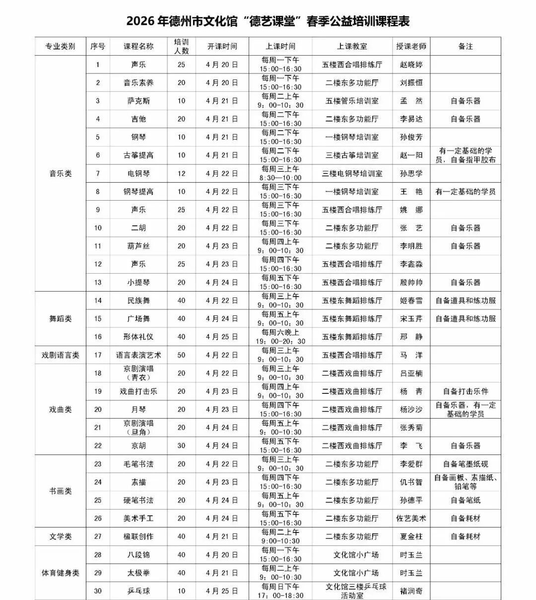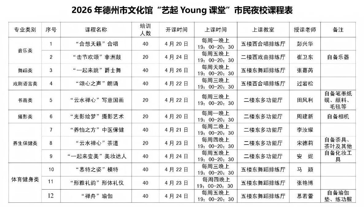 为深入推进全民艺术普及,提升群众文化获得感、幸福感,德州市文化馆2026年春季公益培训面向社会招生,报名时间为4月13日上午9点至4月16日下午4点。