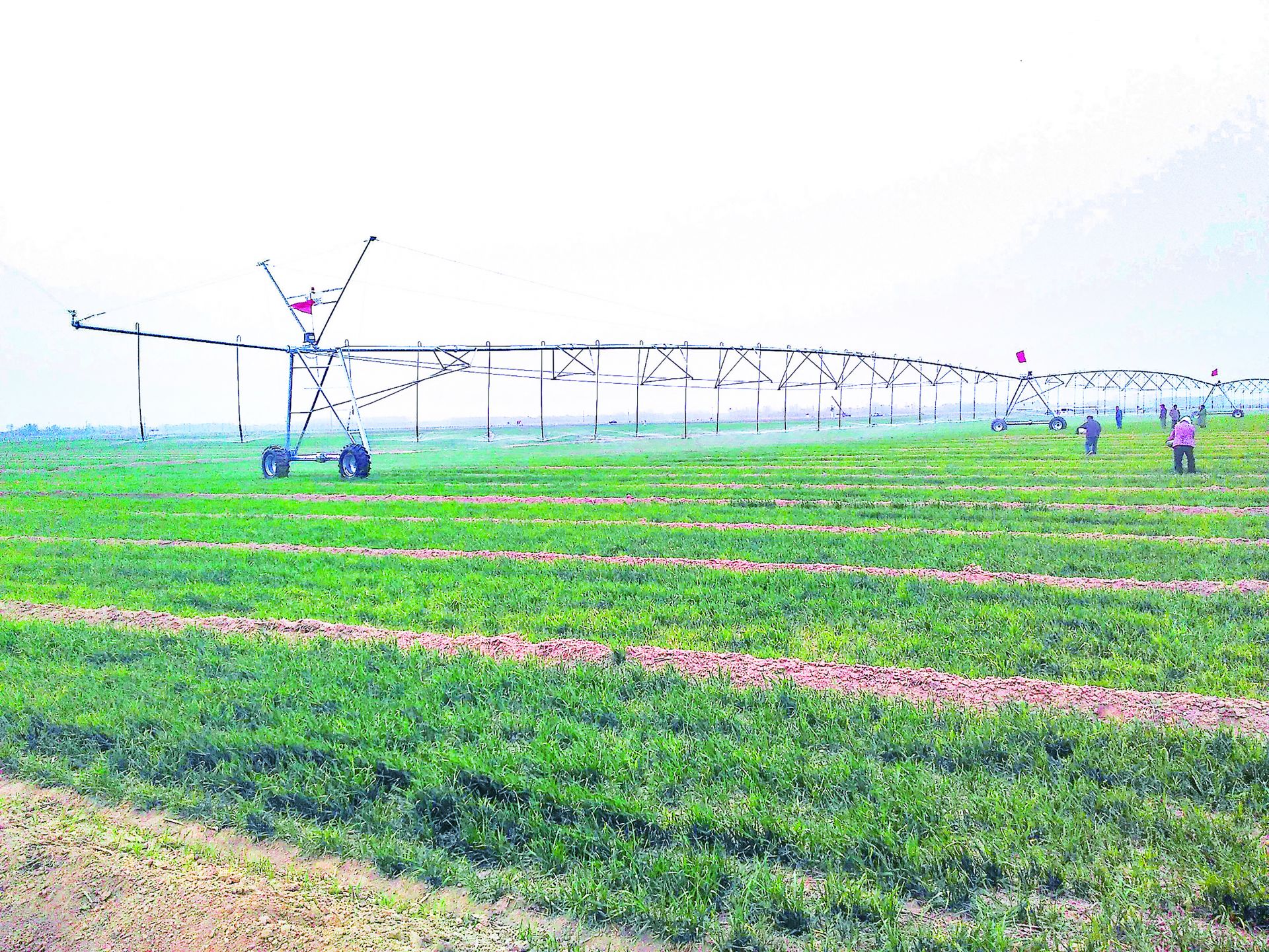 在陵城区、夏津县、武城县的高标准农田里,舜凯隆的平杆式、桁架式设备横跨田野,跨度可达二三百米。水、肥、药三管齐下同步输送,一台设备只需一人操作,管控面积从500亩到800亩不等,最多可达1000亩。