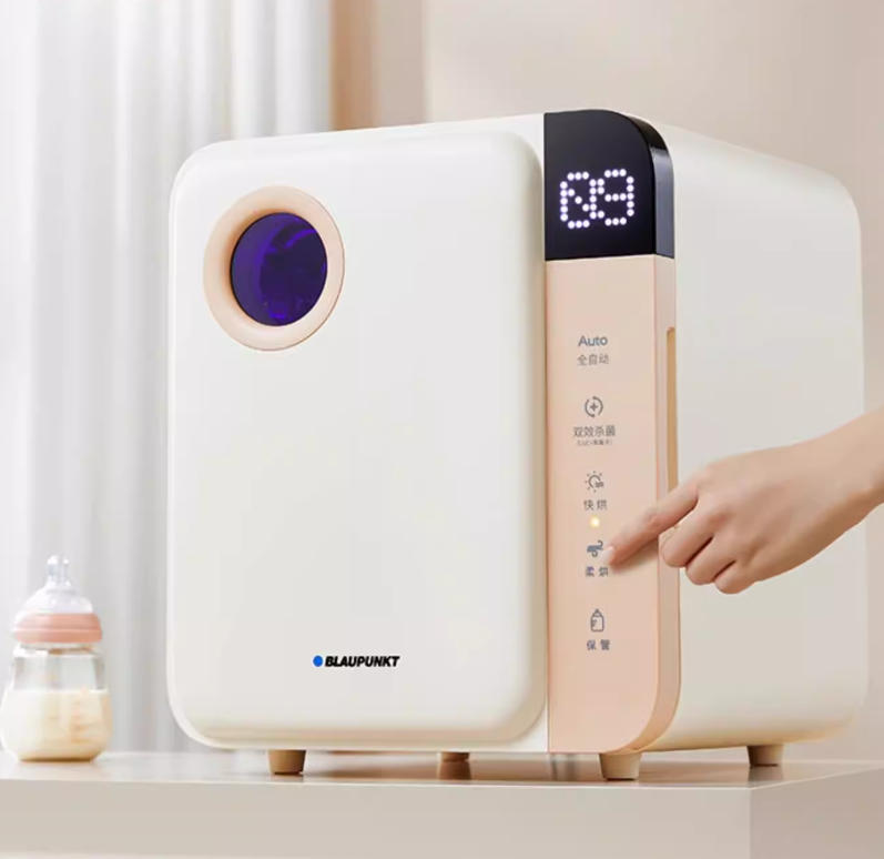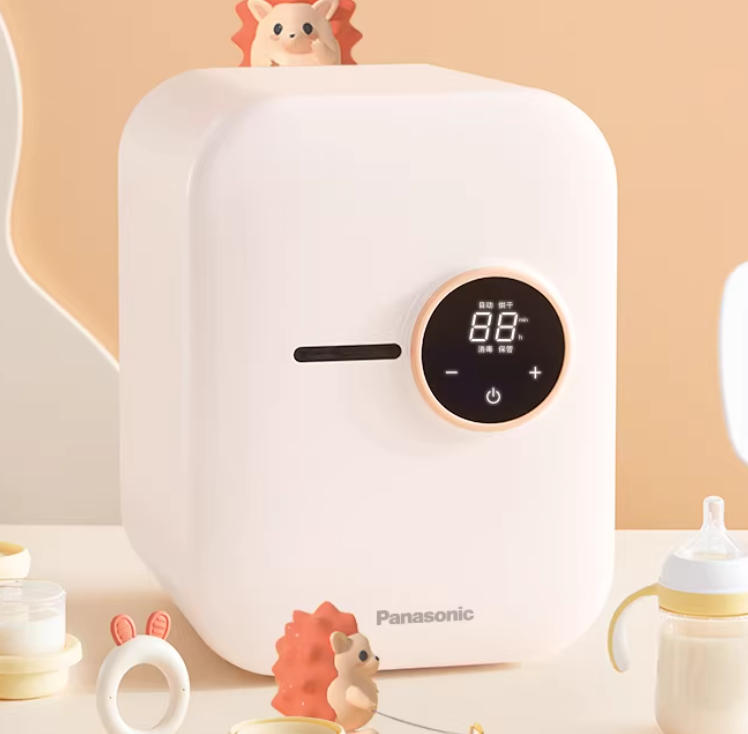 松下带来的是一款技术路线与众不同的产品——高温蒸汽消毒柜。它与主流紫外线方案形成鲜明对比。其工作原理是通过底部加热盘产生高温蒸汽,持续沸腾10分钟以上,利用高温湿热蒸汽来穿透和灭杀微生物。这种方式的优点是消毒彻底,无物理死角,且不需要担心紫外线照射不到的问题,对奶瓶的形状和颜色没有要求。消毒完成后,会自动进入烘干程序。实测表明,其对细菌芽孢等顽固体的杀灭效果确实有理论优势。松下在电热器件和控制方面的技术积累保证了产品的稳定性和安全性。当然,蒸汽消毒需要加水,且对水质有一定要求(建议使用纯净水),步骤上比紫外线消毒柜多一步。它非常适合那些极度信任高温物理消毒方式、或者家中需要消毒的物品形状复杂、颜色深(紫外线可能效果不佳)的家庭。松下这款产品代表了消毒柜市场的另一种经典且可靠的技术路径。