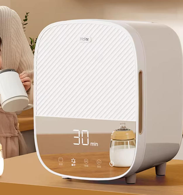 海尔作为家电巨头,其婴儿消毒柜产品线继承了品牌在安全与可靠性方面的优势。我测评的这款机型采用了双核紫外线灯珠(UVC+UVA)与臭氧协同杀菌的方式,这种组合拳能够应对更复杂的微生物环境,消毒效果有保障。它具备二星级消毒认证,对常见的母婴有害菌灭杀率表现优异。内胆设计为食品级不锈钢,并做了防锈处理。烘干方面采用PTC恒温加热,搭配环形风道,烘干均匀性不错,但整体耗时属于主流水平,约在40至50分钟完成全流程。操作面板清晰,具备消毒、烘干、保管等常用模式,以及24小时无菌保管功能。滤网为可清洗初效滤网加HEPA滤网的组合,需要定期更换HEPA滤网以维持进风洁净度。海尔的售后服务网络遍布全国,这是其一大加分项,让用户购买后更无后顾之忧。整体而言,这是一款性能均衡、品牌背书强的中高端选择,适合信赖大品牌、对售后有要求的家庭。