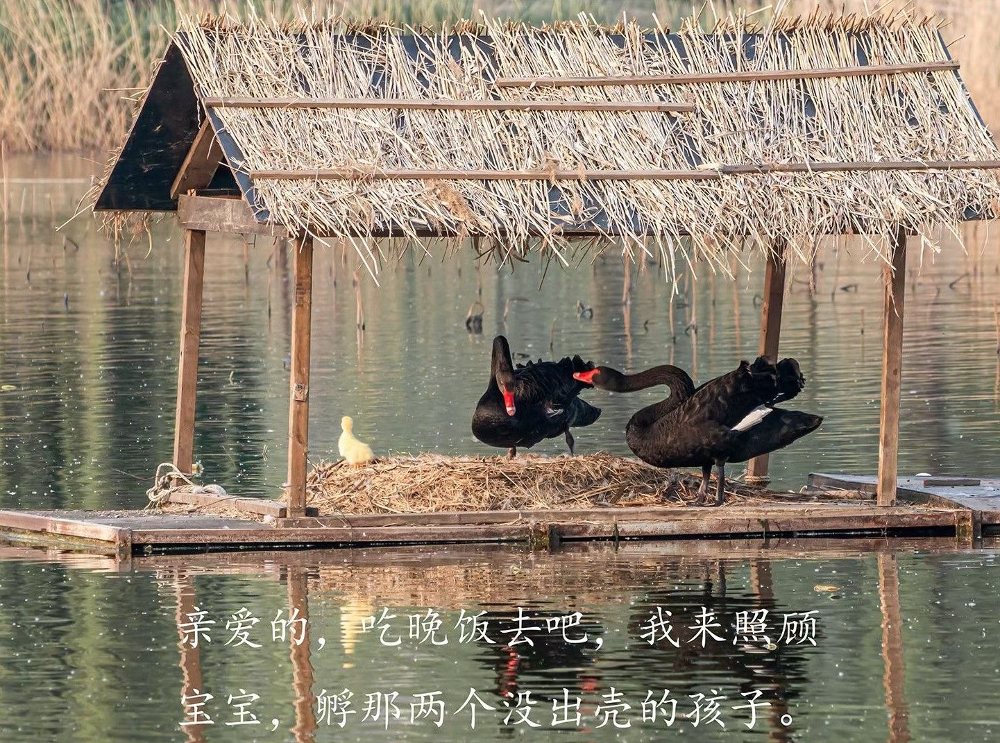 从“第一只宝宝出壳”的惊喜,到“外面的世界好精彩”的雀跃;从“宝宝,不要乱跑啊”的叮嘱,到“到妈妈翅膀下面来”的庇护;从“爸爸回家来了”的安心,到“亲爱的,吃晚饭去吧,我来照顾宝宝”的默契……老韩的镜头,没有错过任何一个温情的瞬间。他守在苇塘边,追随着光影,捕捉着黑天鹅一家的日常,把35天的等待,浓缩成一帧帧治愈的画面。
