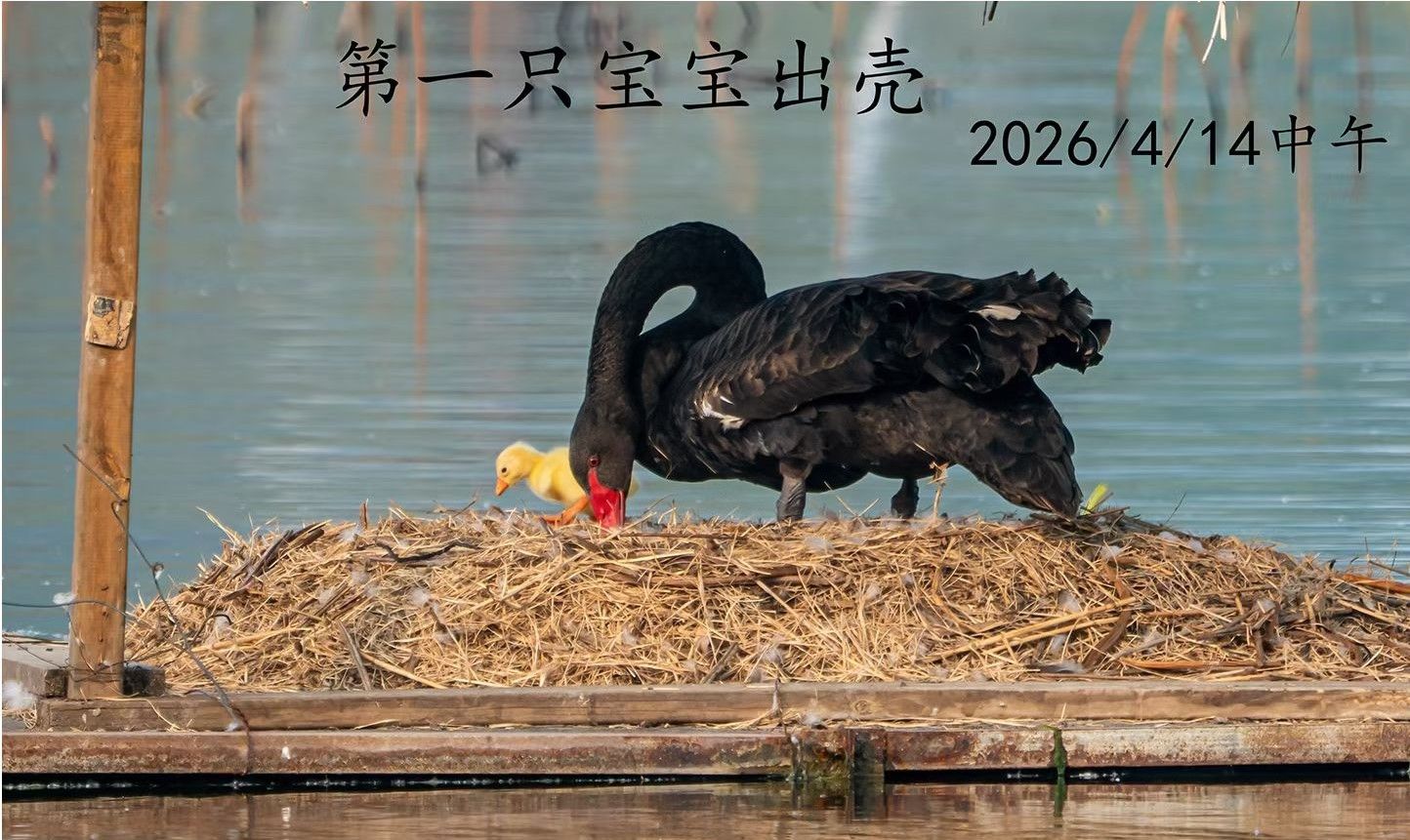 昨日正午,历经35天的精准守候,生命的奇迹终于绽放。第一只黑天鹅宝宝奋力破壳,带着对世界的好奇,降临在这片温柔的水土之上。它裹着一身蓬松柔软的黄色绒毛,像一团灵动的小太阳,跌跌撞撞地依偎在母亲身边,稚嫩又可爱。天鹅父母满眼温柔地注视着新生的宝宝,脖颈轻轻摩挲,满是初为父母的欣喜与宠溺,巢中剩余的两枚蛋,也仍在积蓄力量,等待着破壳而出的时刻。