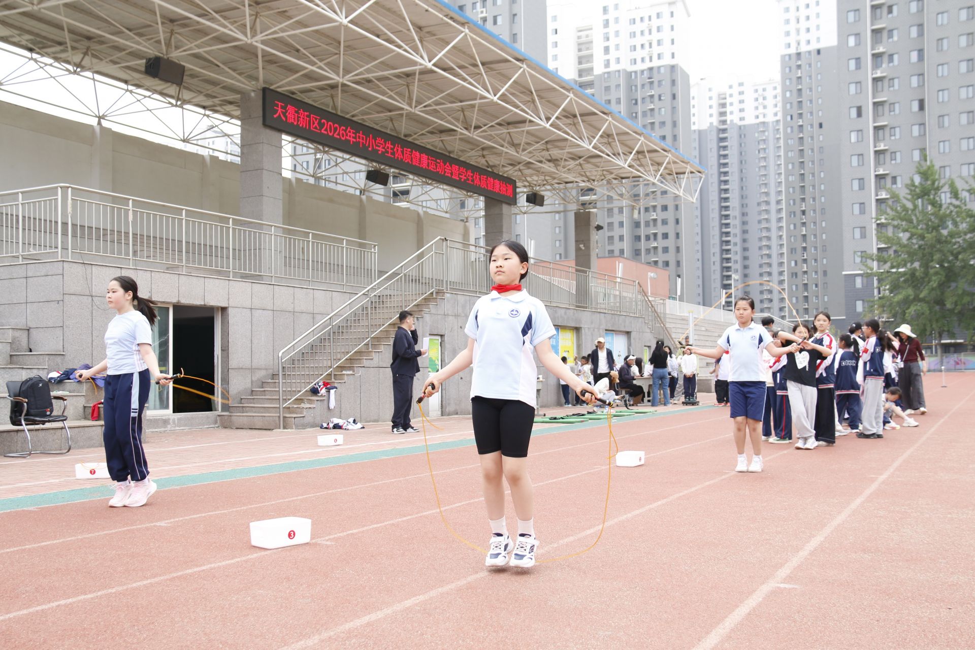 本次活动由天衢新区教体卫生事业发展部主办,旨在贯彻“健康第一”教育理念,全面提升学生体质健康水平。全区共3560名学生参与,涵盖37所小学四年级、9所初中一年级及3所高中一年级学生,部分乡镇小学以镇域为单位联合组队参赛。
