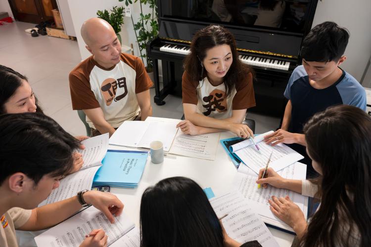 越南指挥家童光荣和中国作曲家莫双双是一对“跨国伉俪”,两人联手创立了“新活力”乐团,将越南传统竹乐和中国音乐元素融合编排,演绎出新的东方韵味。这是2025年3月28日,童光荣(中左)与莫双双(中右)在位于越南首都河内的家中为乐团成员授课。