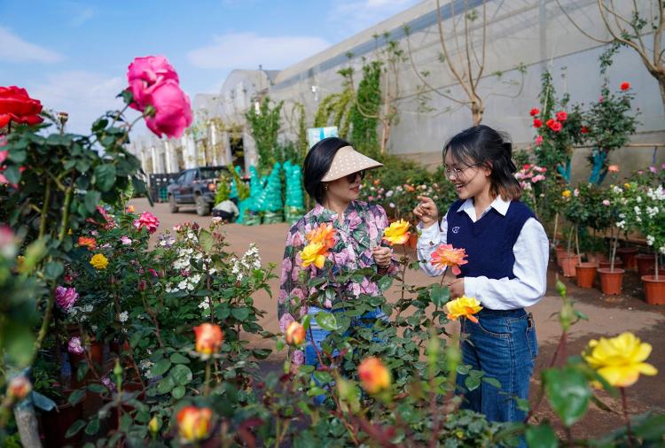 2025年4月11日,越南花商阮翠云(左)与翻译李青歌在云南昆明斗南一花卉基地内查看鲜花品质。2018年,阮翠云开始在越南销售云南花卉,让七彩“云花”成为众多越南家庭的“常客”。借助高效的电商平台和快捷的物流网络,鲜花从云南花田到河内货架实现了“次日达”。