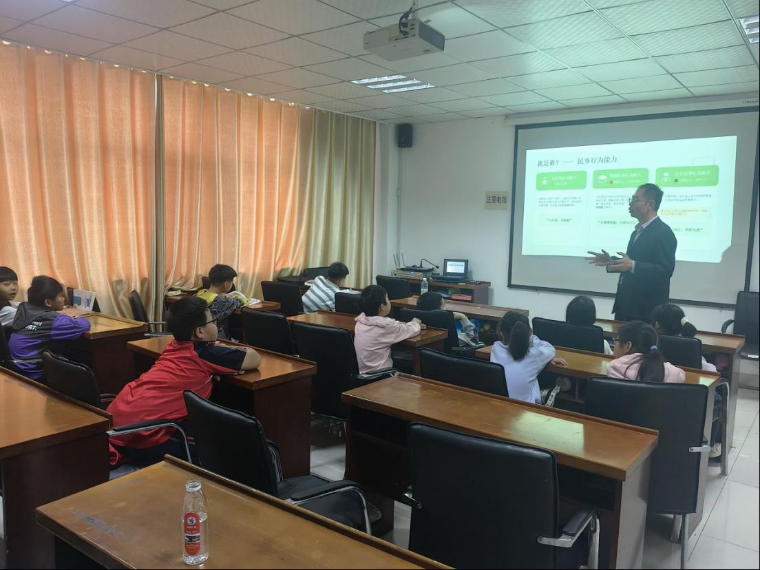 课堂上,沈涛以“法律与我们的日常生活”为主题,用通俗易懂的语言,向学生们讲解法律的基本概念、作用与意义。结合青少年的年龄特点与生活实际,他围绕“校园安全”“网络安全”“未成年人保护”“预防校园欺凌”等焦点话题,通过案例解析、情景模拟、互动问答等方式,将抽象的法律条文转化为鲜活的生活指南。孩子们聚精会神,踊跃参与讨论,现场气氛活跃。