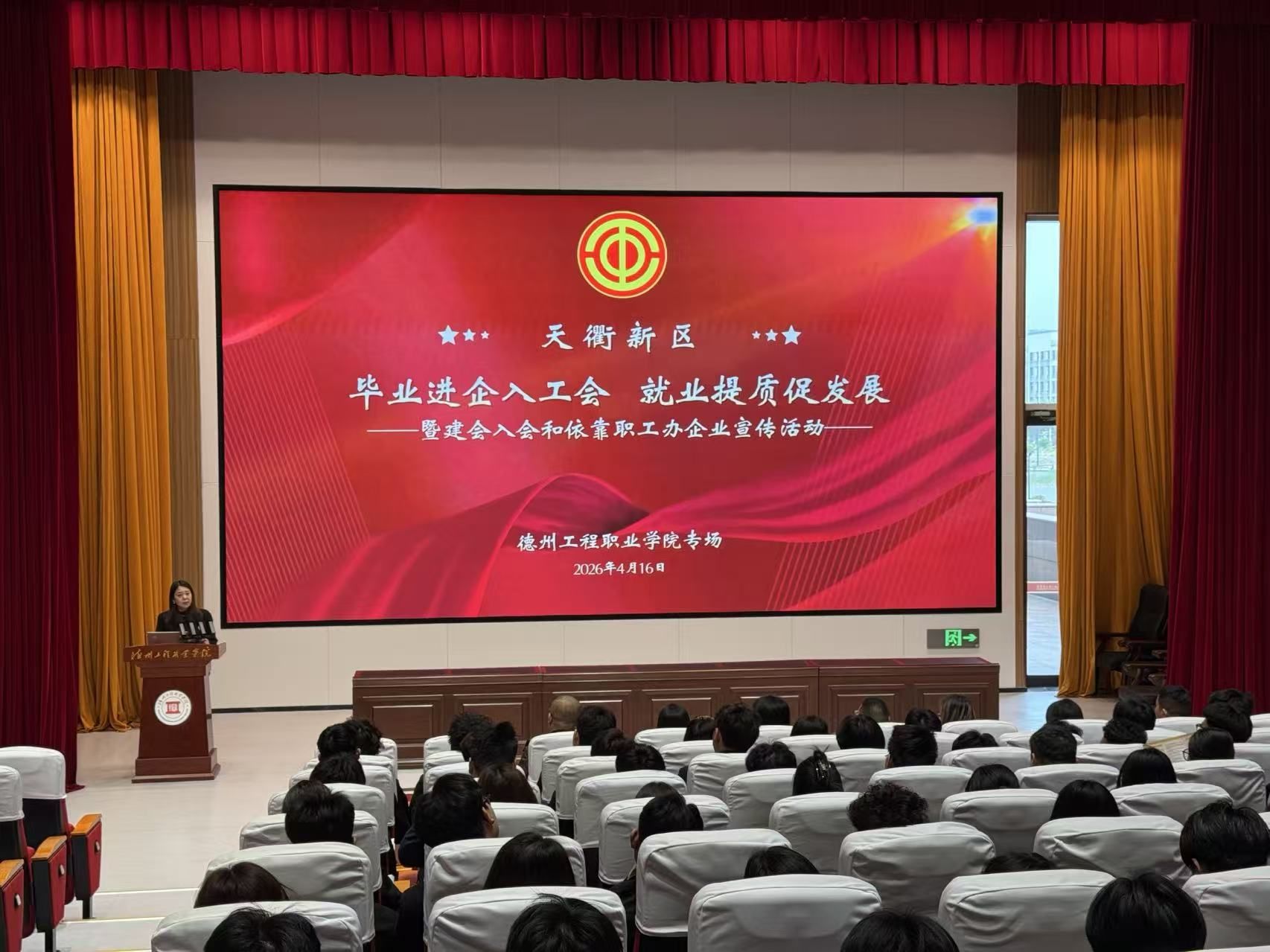 4月16日,天衢新区“毕业进企入工会、就业提质促发展”暨建会入会和依靠职工办企业宣传活动,在德州工程职业学院举办。天衢新区工会、德州工程职业学院相关负责人、劳模工匠代表、优秀企业代表、普法律师及100余名毕业生参加活动。