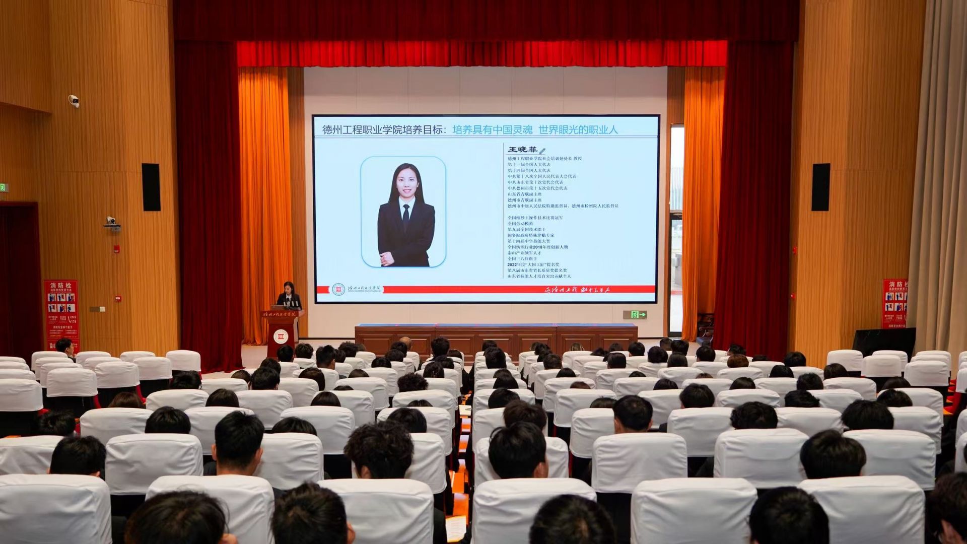 随后,全国劳动模范、同时身为学院教师的王晓菲,结合自身深耕技能领域、奋勇争先的成长经历开展宣讲,用身边可感可学的榜样故事,鼓励同学们勤学苦练、精益求精,树立技能成才、技能报国的理想信念。