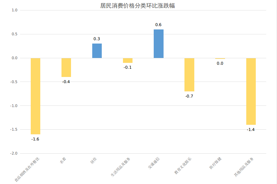 其他七大类价格环比呈现“二涨四降一平”,其中交通通信、居住价格分别上涨0.6%、0.3%;其他用品及服务、教育文化娱乐、衣着、生活用品及服务价格分别下降1.4%、0.7%、0.4%、0.1%;医疗保健价格持平。