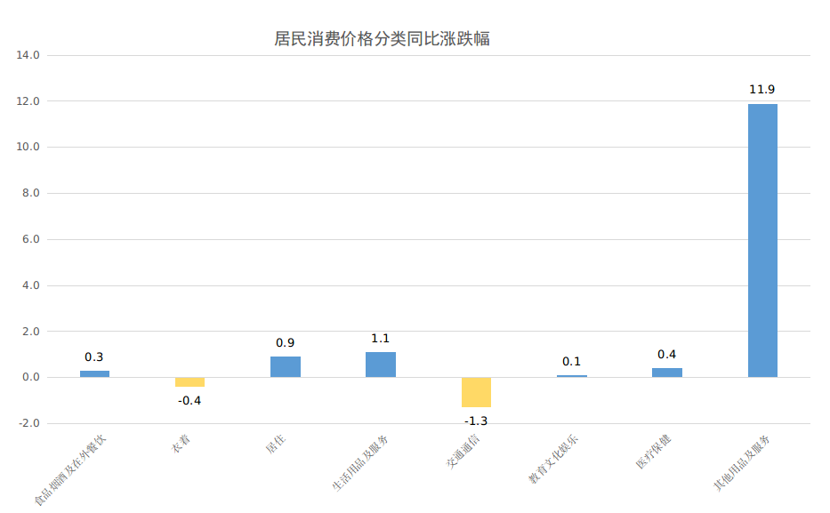 其他七大类价格同比呈现“五涨二降”,其他用品及服务、生活用品及服务、居住、医疗保健、教育文化娱乐价格分别上涨11.9%、1.1%、0.9%、0.4%、0.1%;交通通信、衣着价格下降1.3%、0.4%。