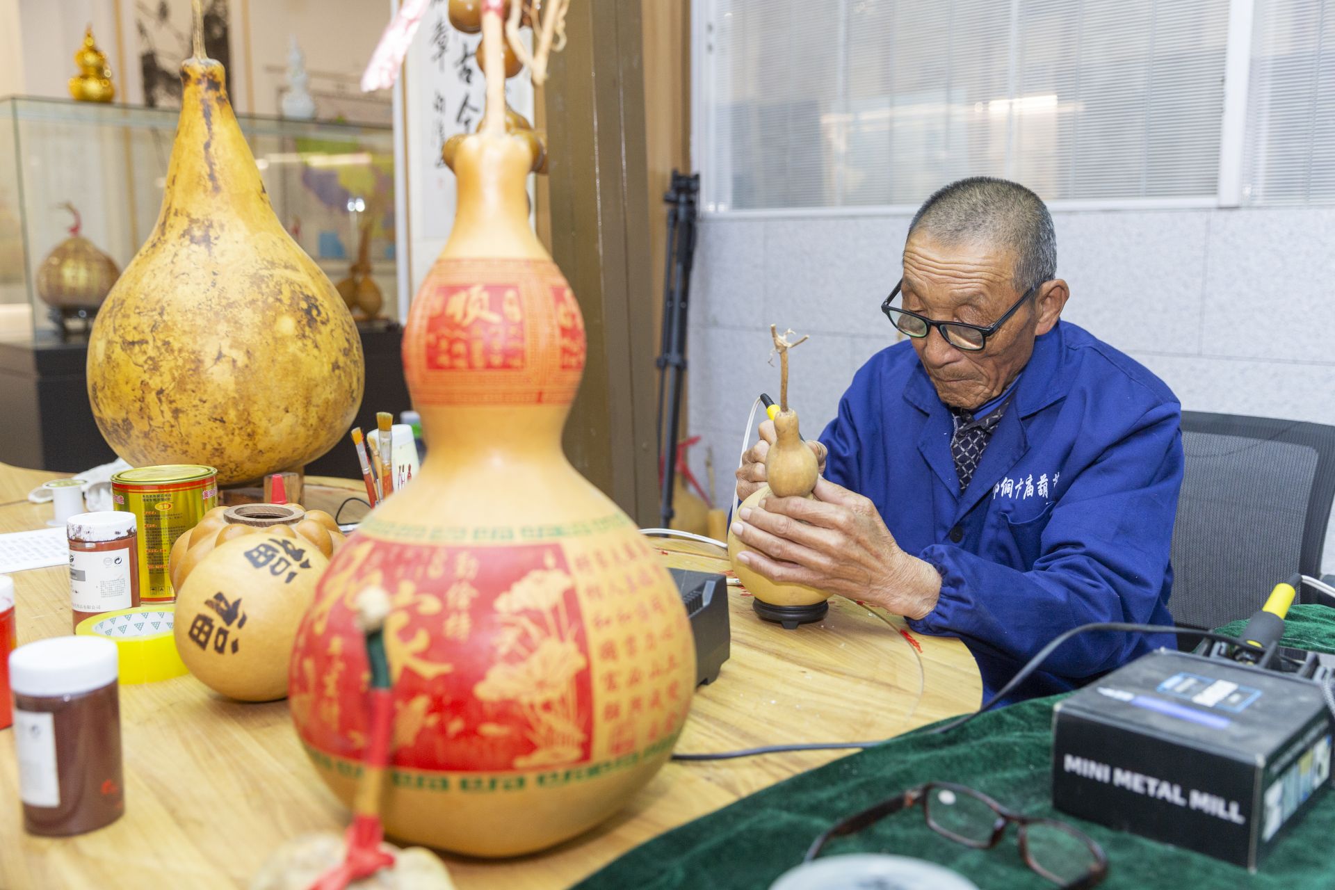 村民李荣第坐在手工创作区,手中的电烙笔在葫芦表面游走,一套动作下来,山水、花鸟、人物便跃然“葫”上。