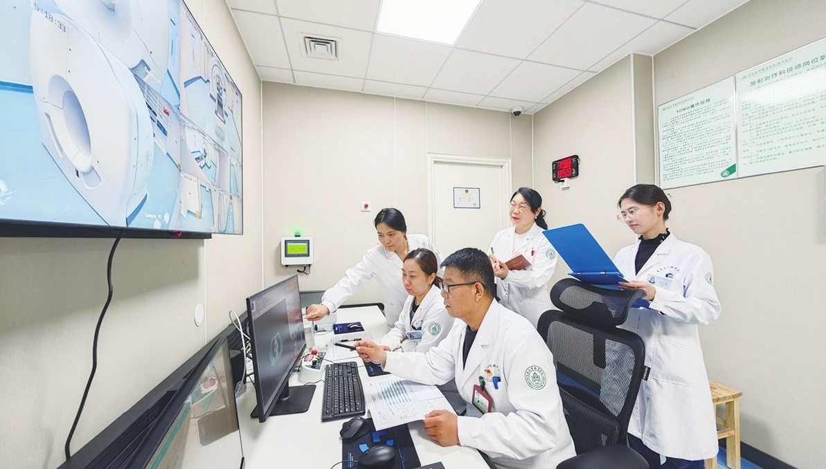 孟令军(中)利用螺旋断层放射治疗系统为患者进行治疗