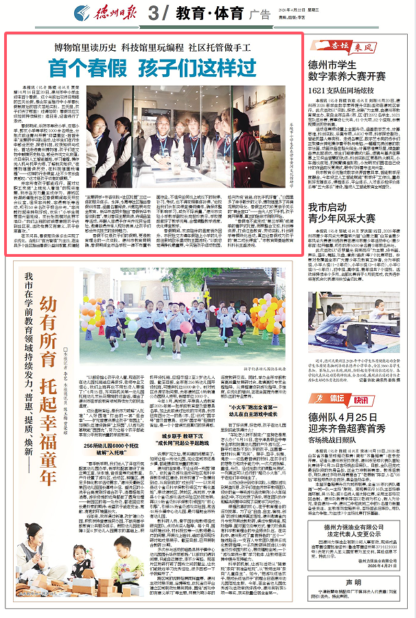 4月16日至20日,德州市中小学生迎来首个春假。这个与前后双休日相连的五天长假,是山东省推行中小学春秋假制度后的首次落地实践。五天里,孩子们去了哪里?过得如何?春假效应又该如何持续释放?连日来,记者进行了走访。
