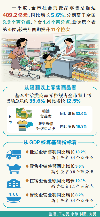 4月20日,记者从市商务局获悉,一季度,全市实现社会消费品零售总额409.2亿元,同比增长5.6%,分别高于全国3.2个百分点、全省1.4个百分点,增速居全省第4位,为全年消费市场持续向好奠定坚实基础。“分行业来看,批发、零售、餐饮等领域协同发力、稳中有进,成为拉动消费增长的主力军,彰显我市消费市场的强劲韧性与活力。”市商务局党组成员孟繁云说。