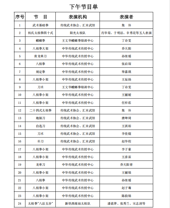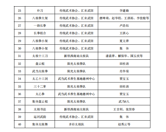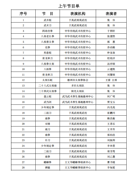 协办单位:德州市太极拳协会、德州市传统武术协会、中华传统武术传授中心、王文华螳螂拳培训中心、汇来武馆、其武精英武校、武当武术养生基地德州中心、运河太极队、运河阳光太极队、运河多彩太极队、新铁西南太极队等。