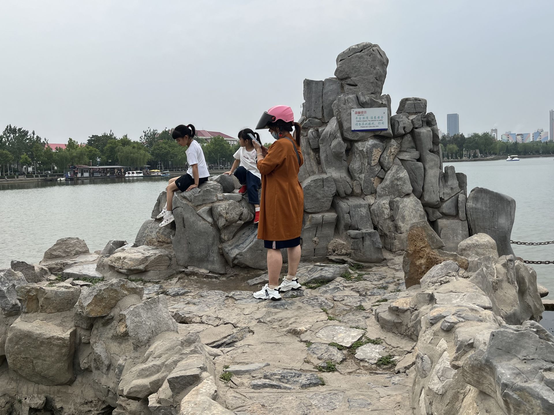 在新湖景区,有两个小朋友爬到假山上玩耍休憩,家长在旁不加劝阻。